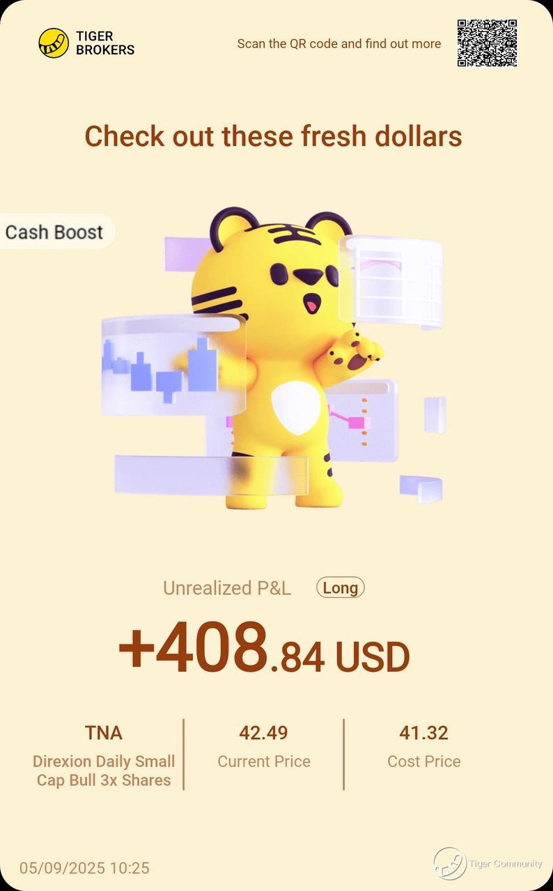 $Direxion Daily Small Cap Bull 3x Shares(TNA)$ 's 3x small-cap ride was wild! Russell 2000 popping on strong data, caught the perfect wave. But leveraged ETFs are too crazy - cashing out gains now!