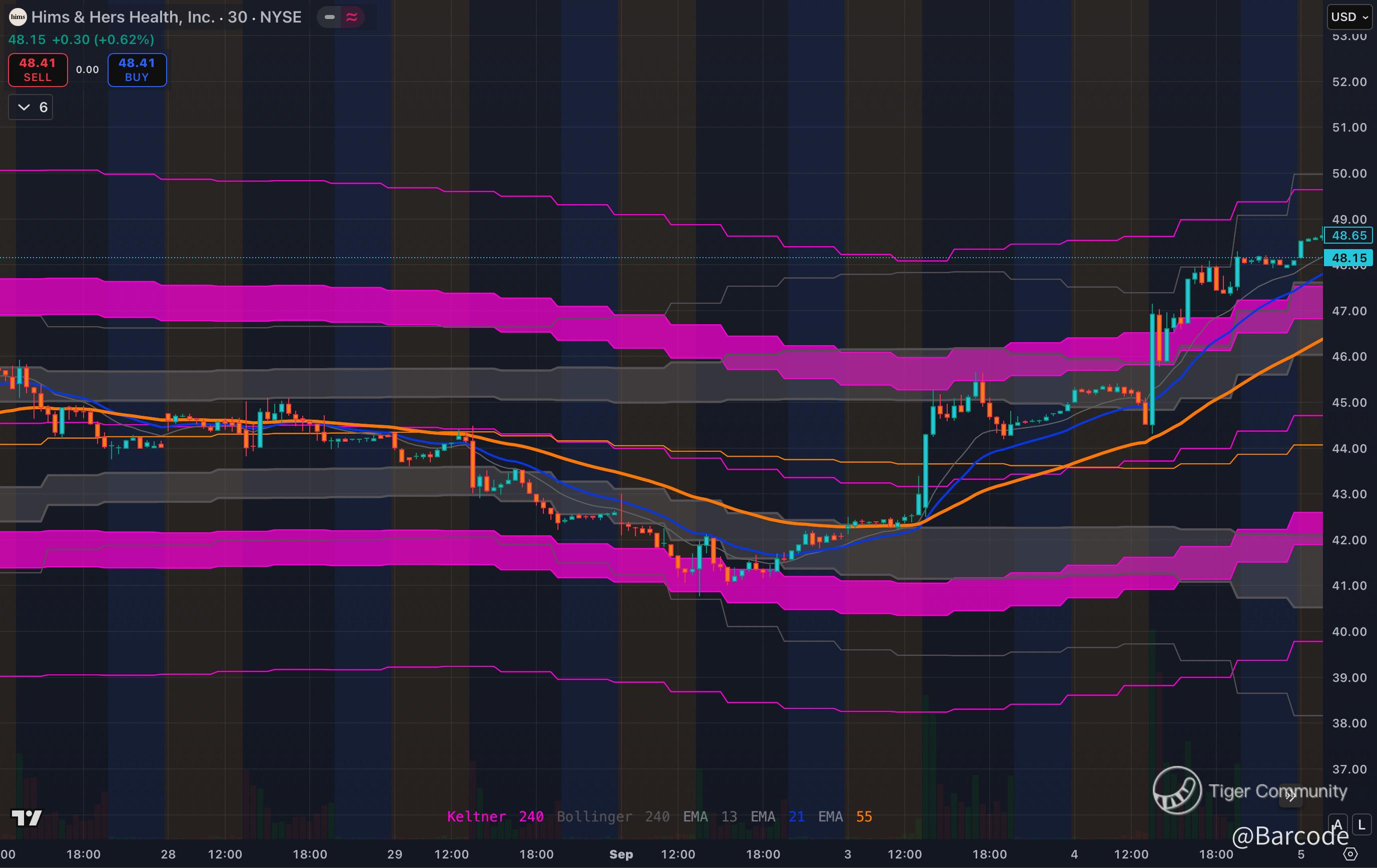 Beautiful reversal. EMAs flipped bullish, momentum regained. Above $49, this name enters price discovery. Wellness TAM keeps compounding, and Hims keeps proving skeptics wrong.