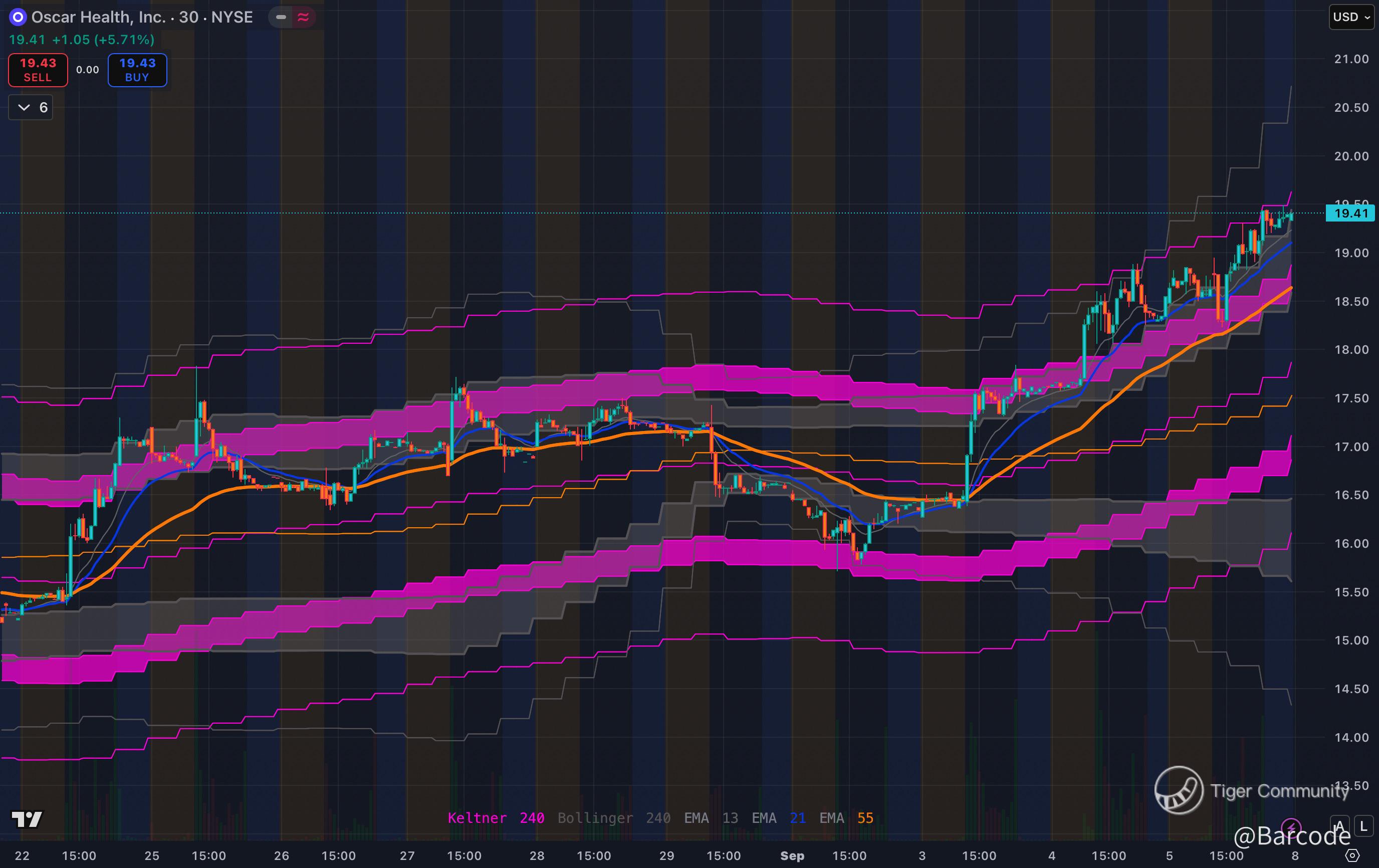 Ripping through upper Keltner bands with strong volume. If it holds above $19.50, I see a clear runway toward $21. Growth + healthtech disruption in one package.