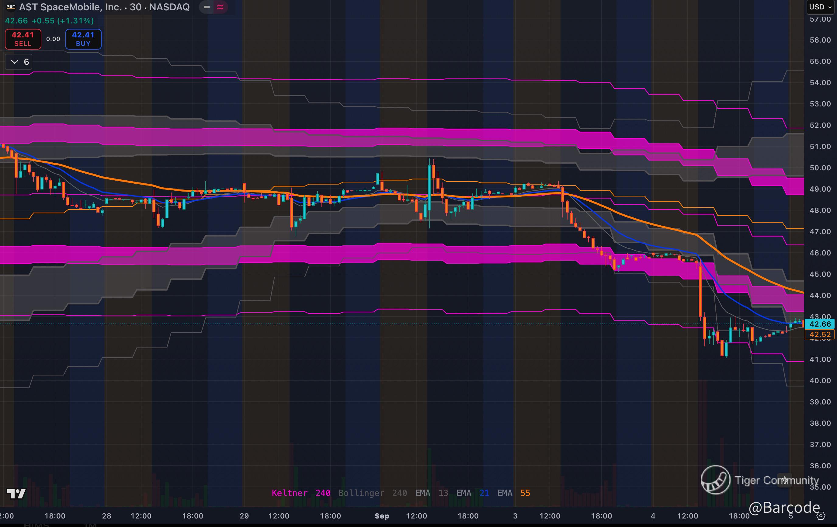 Flushed through support, now rebasing near $42. If structure rebuilds, the long-term upside is enormous. Direct-to-device satellite mobile is a trillion-dollar vision.