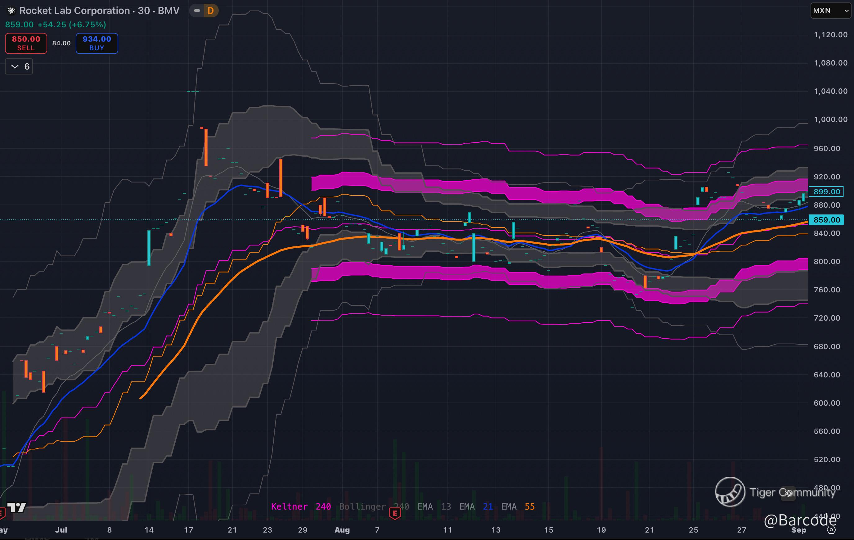 I’m long here. Daily chart shows EMA reaccumulation with upside momentum. Mars comms + Neutron rockets = serious moat. Holding $900 MXN keeps the path clear to push higher.