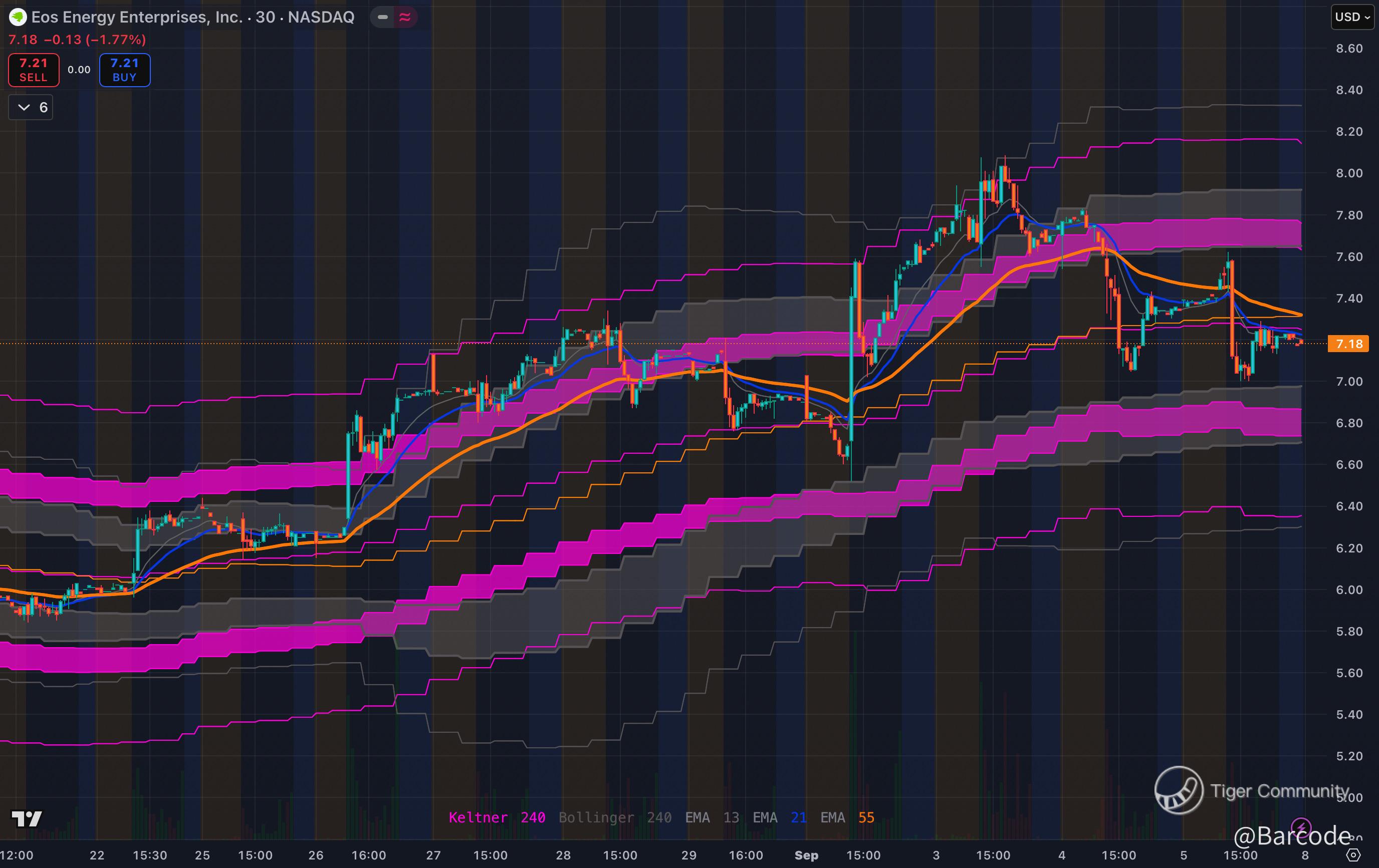 Coiling after failing $7.50 breakout. Still basing above support. Energy storage is a hidden lever for AI scale; reclaiming $7.40 sets up the next move higher.