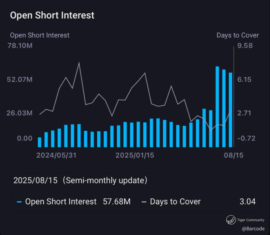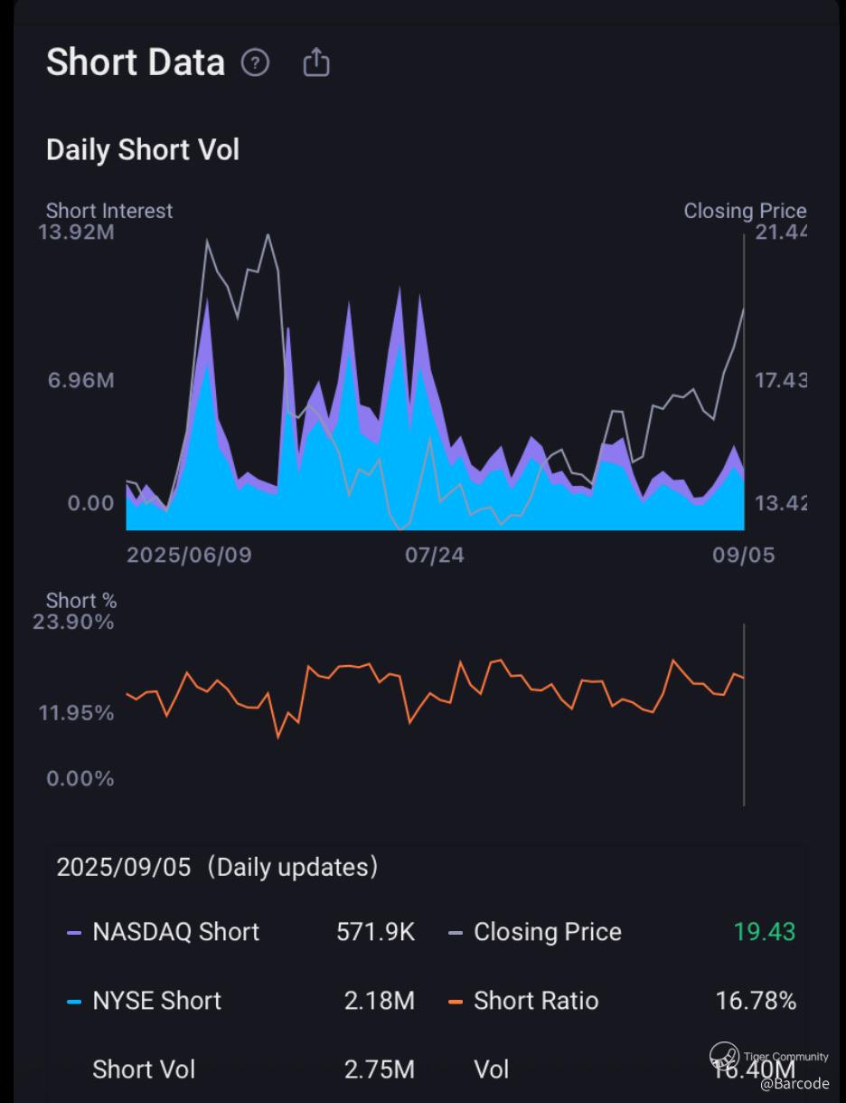 Short interest stands at nearly 24% with open short positions at 57.7M shares. That translates to just over 3 days to cover. Daily short volume remains elevated at 2.75M, with whales steadily participating. This is tinder waiting for a spark. Once momentum accelerates, the unwind could force a violent repricing higher.