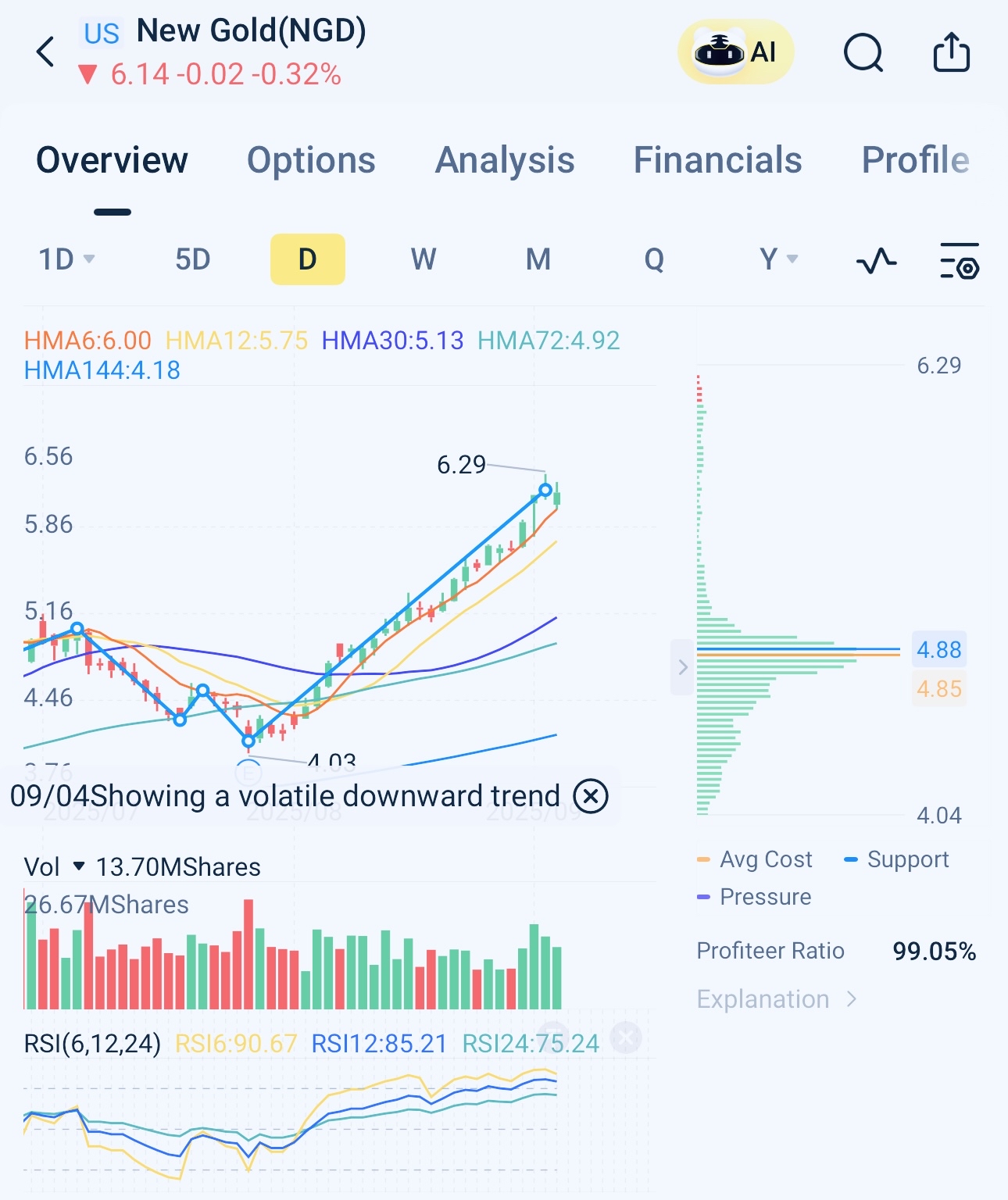 Since late July, New Gold’s stock has risen consistently. On July 28, NGD reported its Q2 2025 earnings, where EPS exceeded expectations, but revenue fell short, causing a temporary dip in its stock price. However, the stock has since rebounded strongly, repeatedly setting new highs.