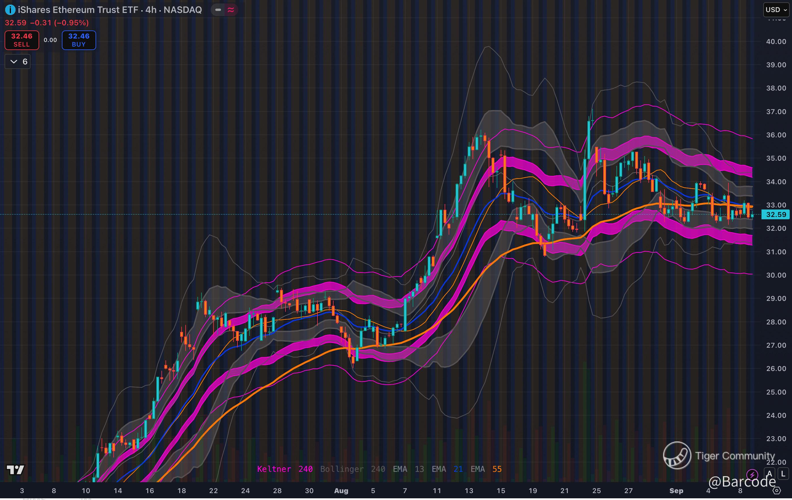 $IBIT is coiling around $63.70 inside Bollinger and Keltner channels, a textbook setup for a volatility release. Ethereum at $32.59 sits lower in its range, trading heavy and reflecting weaker demand. The structure confirms Bitcoin’s resilience versus ETH.