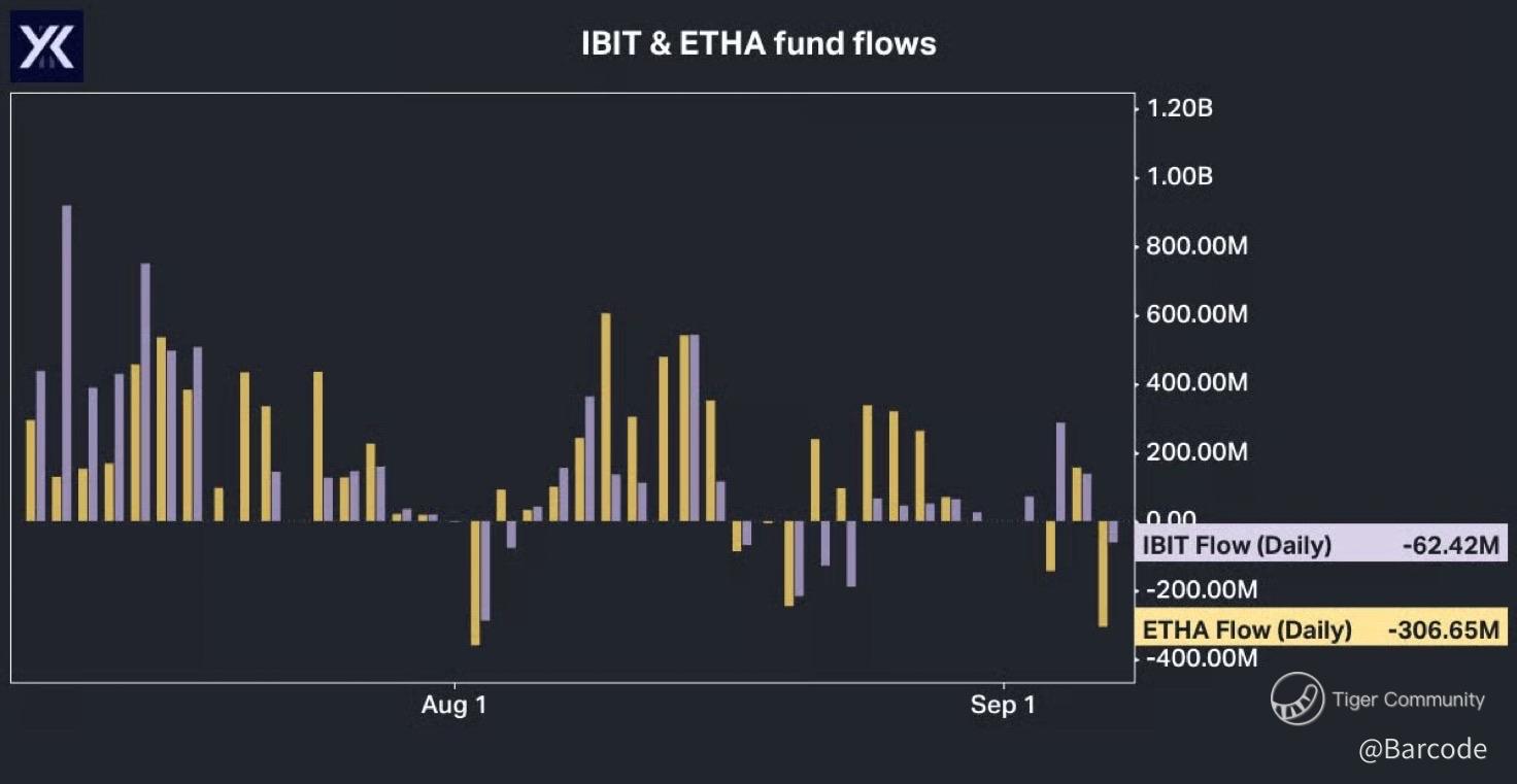 $IBIT flows were slightly positive last week but slipped to –62.42M daily outflows. $ETHA, however, looks weaker with –306.65M in a single day. The scale of Ethereum outflows shows institutions are reducing ETH allocation faster than BTC, tilting leadership to Bitcoin.