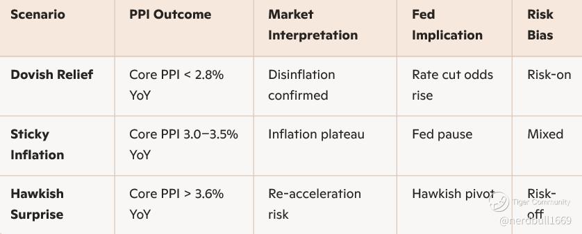 Equities: A "benign" (at or below consensus) PPI report would likely be a positive catalyst for the stock market, as it increases the probability of future rate cuts, which can boost corporate earnings and valuations. A hot report, however, would likely be a negative for stocks, as it could lead to higher bond yields and concerns about economic growth.
