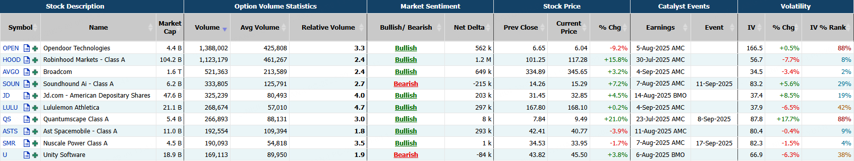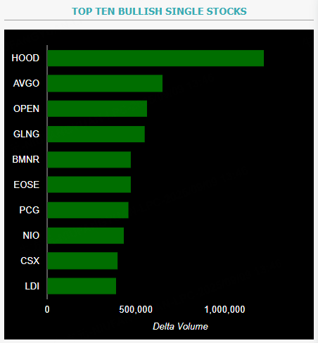 This report shows stocks with the highest volume of bullish and bearish activity by option delta volume, which converts option volume to an equivalent stock volume (bought or sold).