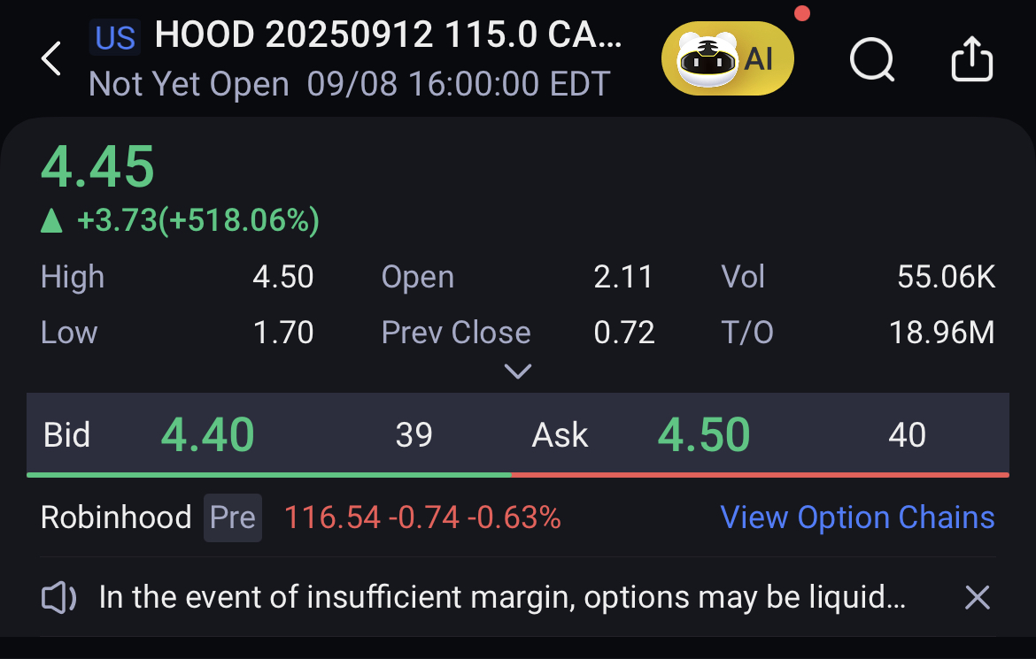 A total number of 1.13 million options related to $Robinhood(HOOD)$ were traded on Monday, of which call options accounted for 68%. Particularly high volume was seen for the $115 strike call option expiring Sept. 12, with 55,057 contracts trading. The $115 strike call option expiring Sept. 12 surged 518% on Monday. $HOOD 20250912 115.0 CALL$