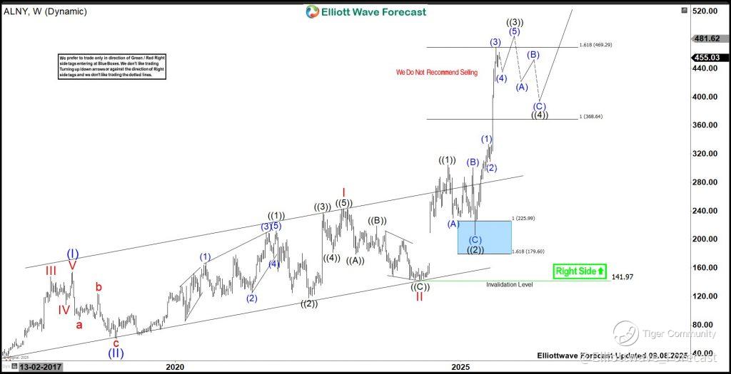 ALNY is showing strong rally from April-2025 low in previous article & expect further rally once (4) pullback ends. It rallied more than 40% since last update in (3) of ((3)). It expects one more push higher to finish April-2025 cycle in ((3)) before correcting next. We like to buy the pullback in ((4)) in 3, 7 or 11 swings at extreme area.