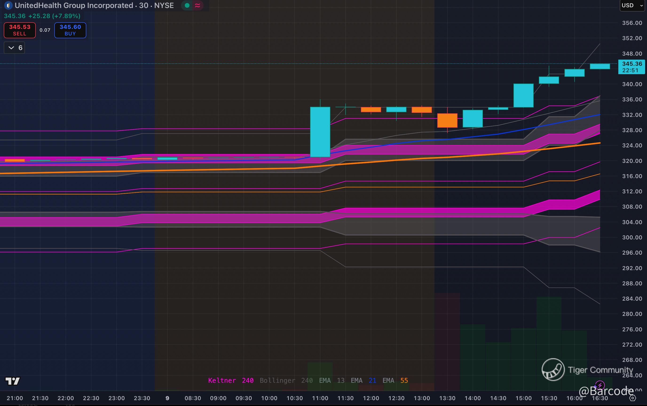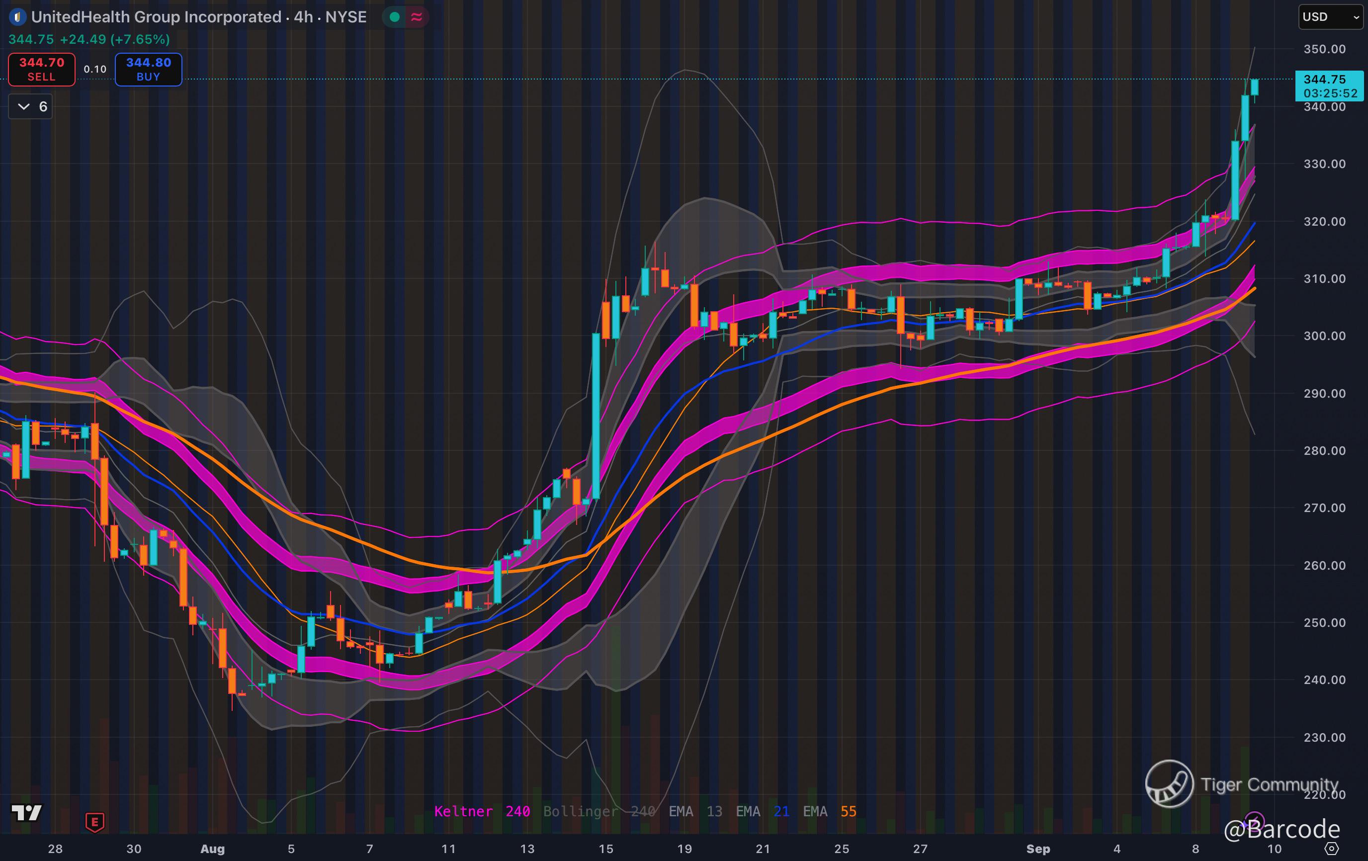 On the weekly chart, the wedge structure mirrors prior inflection zones. Historically, $UNH has launched 100%+ rallies after similar decade-long compressions, and the current formation projects a comparable expansion. The 30-minute and 4H Keltner/Bollinger expansions show fresh momentum breaking out of compression.