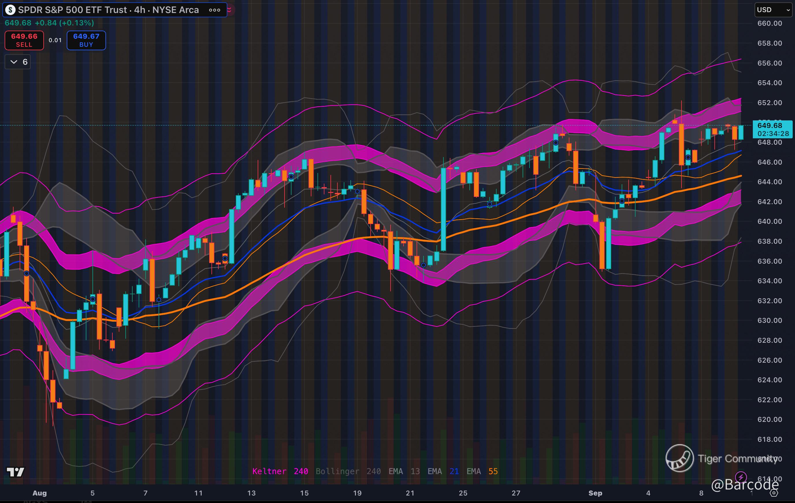 On the 4H Keltner/Bollinger chart, price is coiled tight at the upper envelope; a classic setup before a liquidity flush. On the 30m, every dip toward $648.97 has been absorbed, while sellers stack firepower at $650.52. This isn’t random chop; it’s controlled positioning.