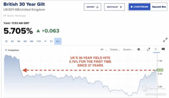 Let’s start with the numbers. UK gilt yields have surged to 5.7%, the highest level since April 1998. That’s a 27-year high, and it tells us that the bond market has entered dangerous territory.