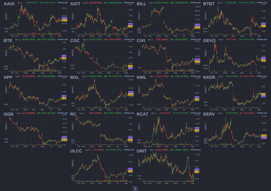$Applied Optoelectronics(AAOI)$ $PowerFleet, Inc.(AIOT)$ $BILL HOLDINGS INC(BILL)$ $Bit Digital, Inc.(BTBT)$ $Baytex Energy Corp.(BTE)$ $Canopy Growth Corporation(CGC)$ $Civitas Resources(CIVI)$ $Gevo(GEVO)$ $Hudson Pacific Properties(HPP)$ $MaxLinear(MXL)$ $Newell(NWL)$ $Nextdoor Holdings(NXDR)$ $Organon & Co(OGN)$ $Ready Capital Corp(RC)$ $Red Cat Holdings Inc.(RCAT)$ $Serve Robotics Inc.(SERV)$ $Frontier Group Holdings, Inc.(ULCC)$ $Uniti Group Inc(UNIT)$