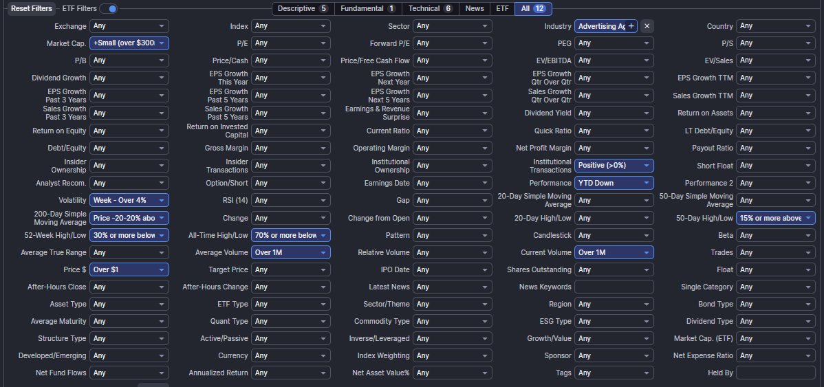 This week’s 18 beaten-down stocks — potential long-term cup-and-handle setups with positive institutional accumulation over the past 3 months