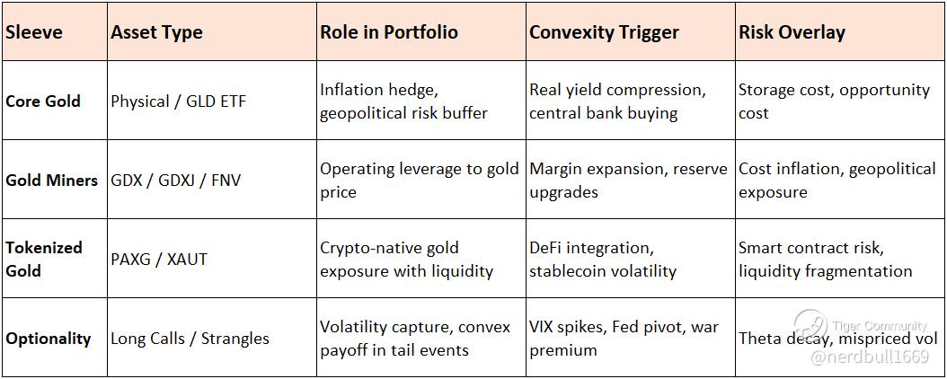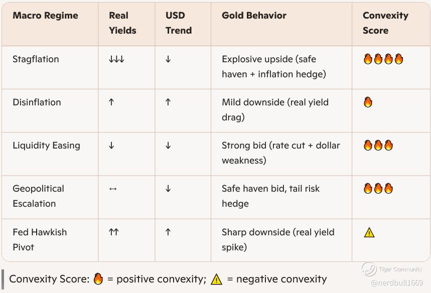 Gold’s convexity is highest in stagflation + geopolitical risk regimes—ideal for barbell sleeves with miners and options.