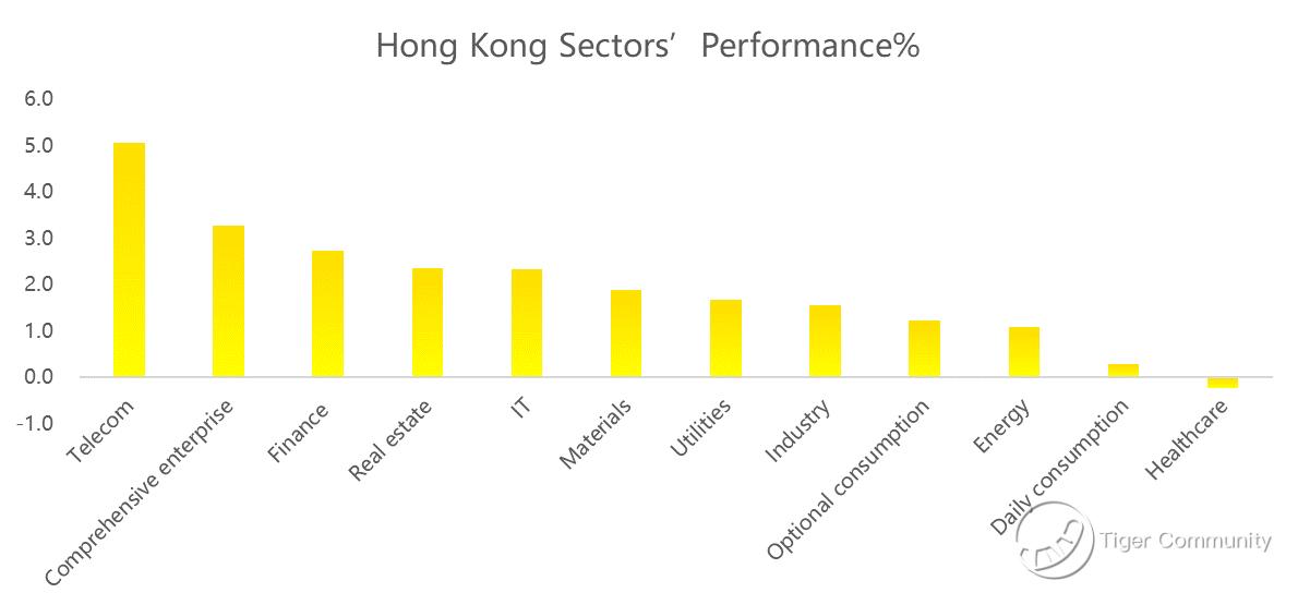 This week, telecoms, financials, and information technology led the gains, while health care lagged.