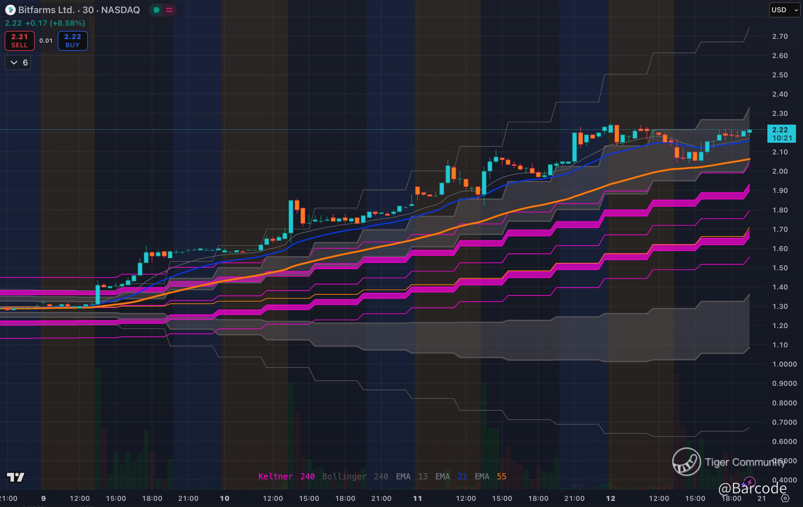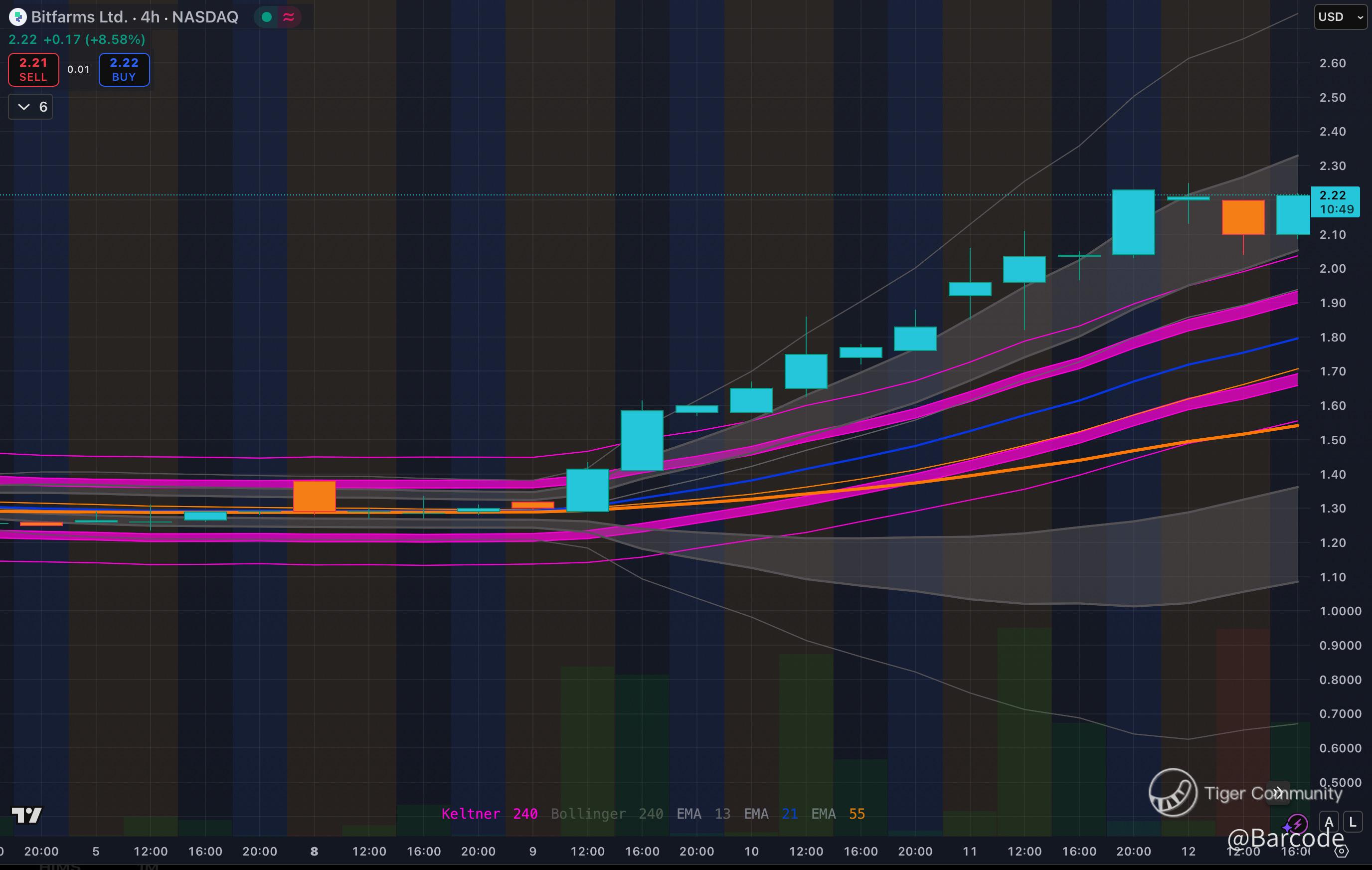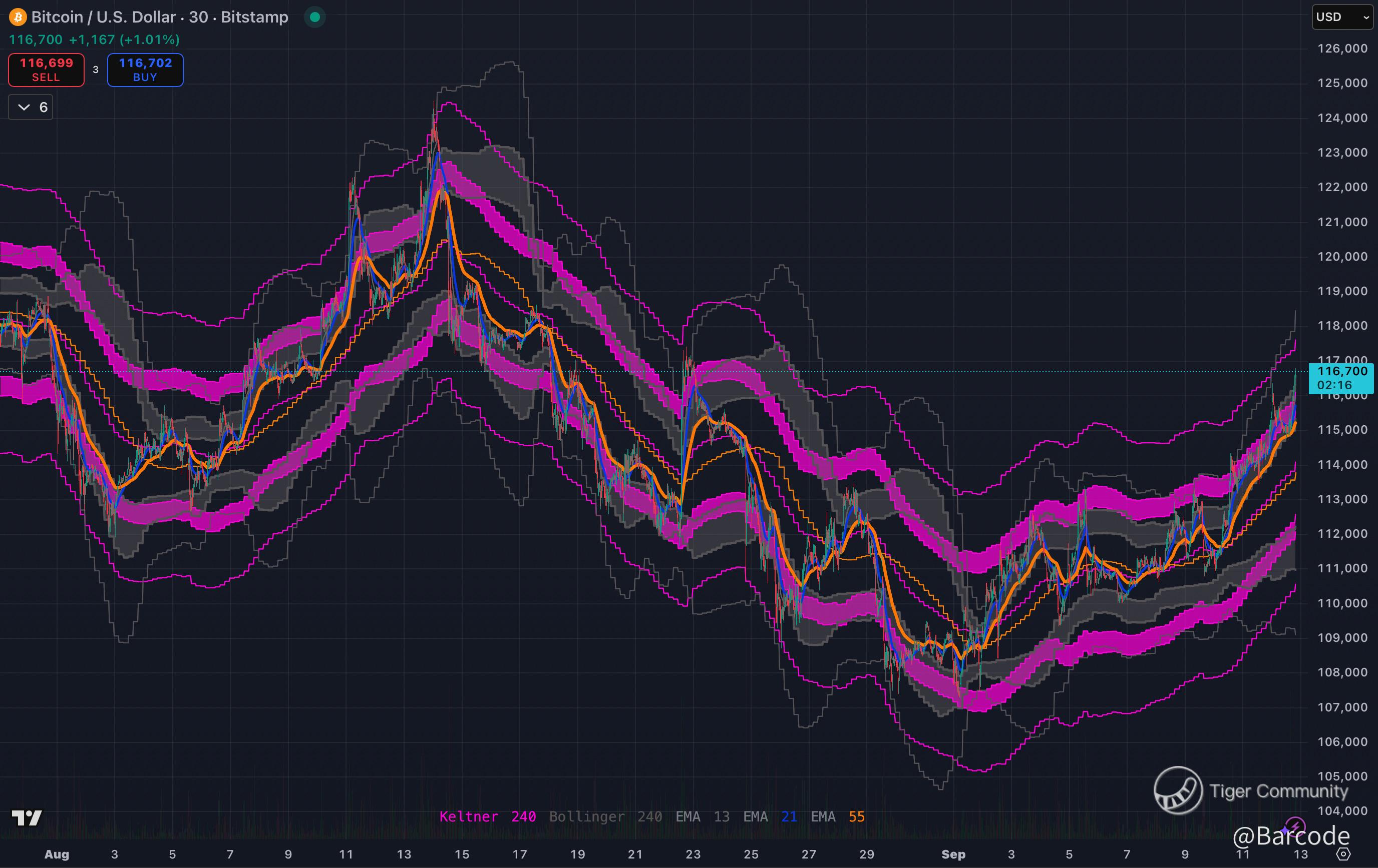 β’ On lower timeframes price is riding the upper Keltner and Bollinger bands and has reclaimed the 55 EMA with authority.
