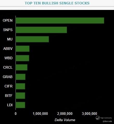 β’ π·ππ· The rare triple blue diamonds are flashing. BITF also landed in the Top 10 bullish single stocks by delta volume alongside OPEN, SNPS, MU, CRCL, CIFR and others.
