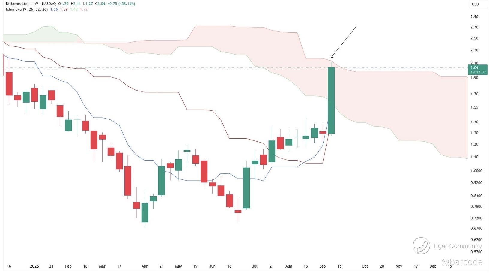 β’ BITF penetrates the weekly Ichimoku cloud and is all the way in, with the tip almost touching the top of the gorging cloud, leaving no room for imagination and fantasy.