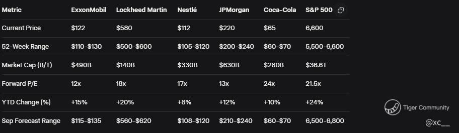 Energy: ExxonMobil at $122, up 15% YTD, thrives on $74.20 oil, with a 12x P/E.