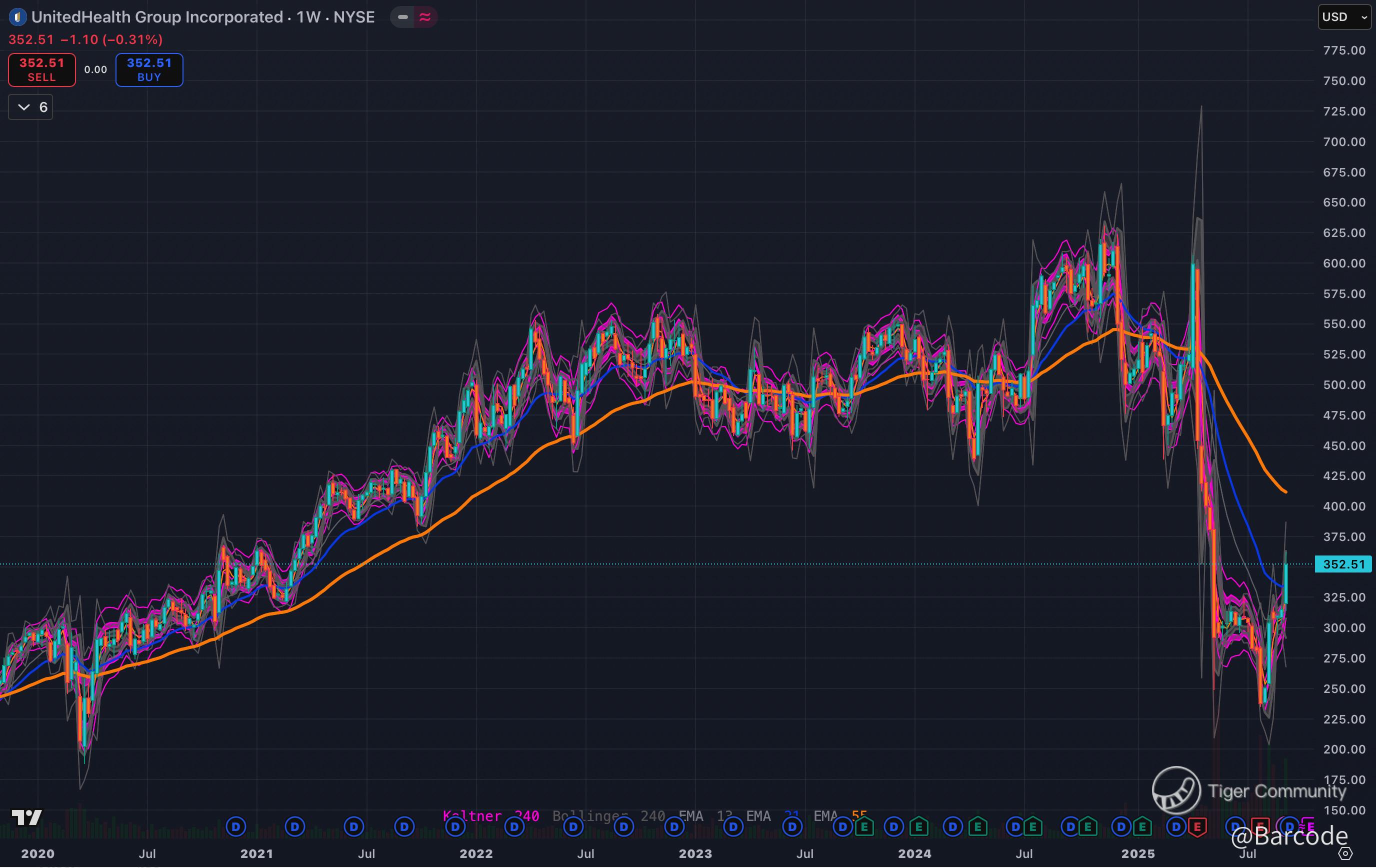 Breakout over $350 now sets short-term target $370 and medium-term path toward $395β400. Support holds at $345β347, and history shows UNH breakouts of this structure deliver 12β15% measured moves.