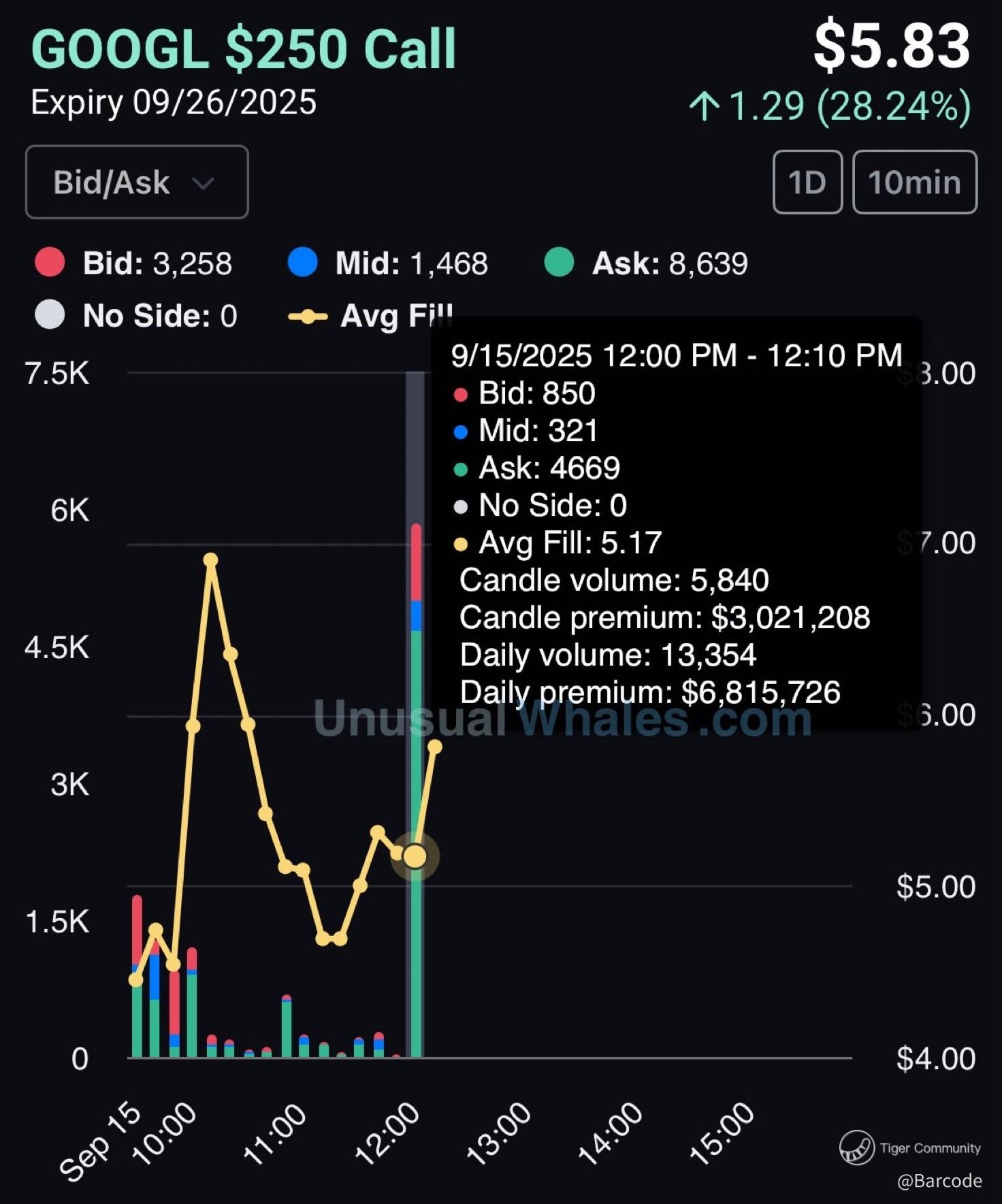 $GOOGL ripped +4% intraday to $250.57, with a monster $3M call sweep at the $250 strike expiring 26Sep25. Across the Mag 7, more than $200M in net call premium surged in, confirming institutions are fueling this breakout.