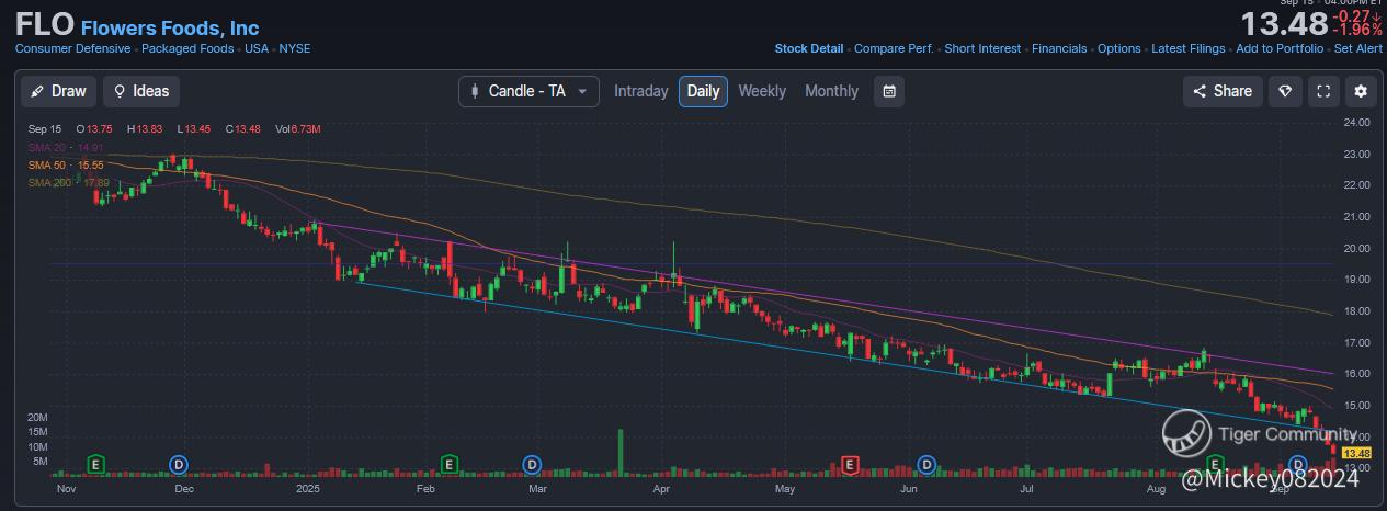 By 2024, the market had begun re-rating Flowers as a “no-growth income stock.” Still, shares hovered near $20 for much of the year. The real shock came in 2025: weaker-than-expected earnings, cautious forward guidance, and intensifying competitive pressures drove the stock down into the mid-teens.