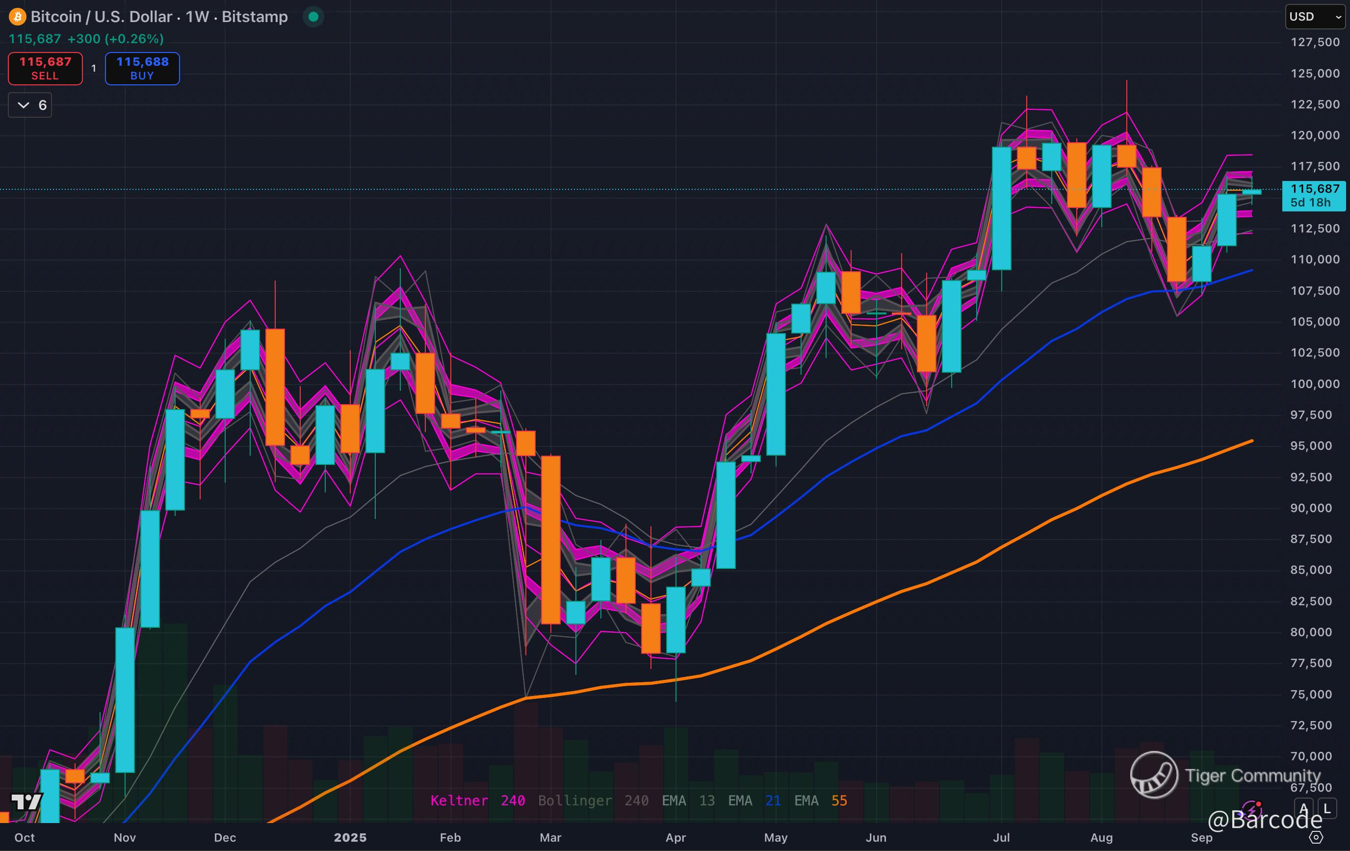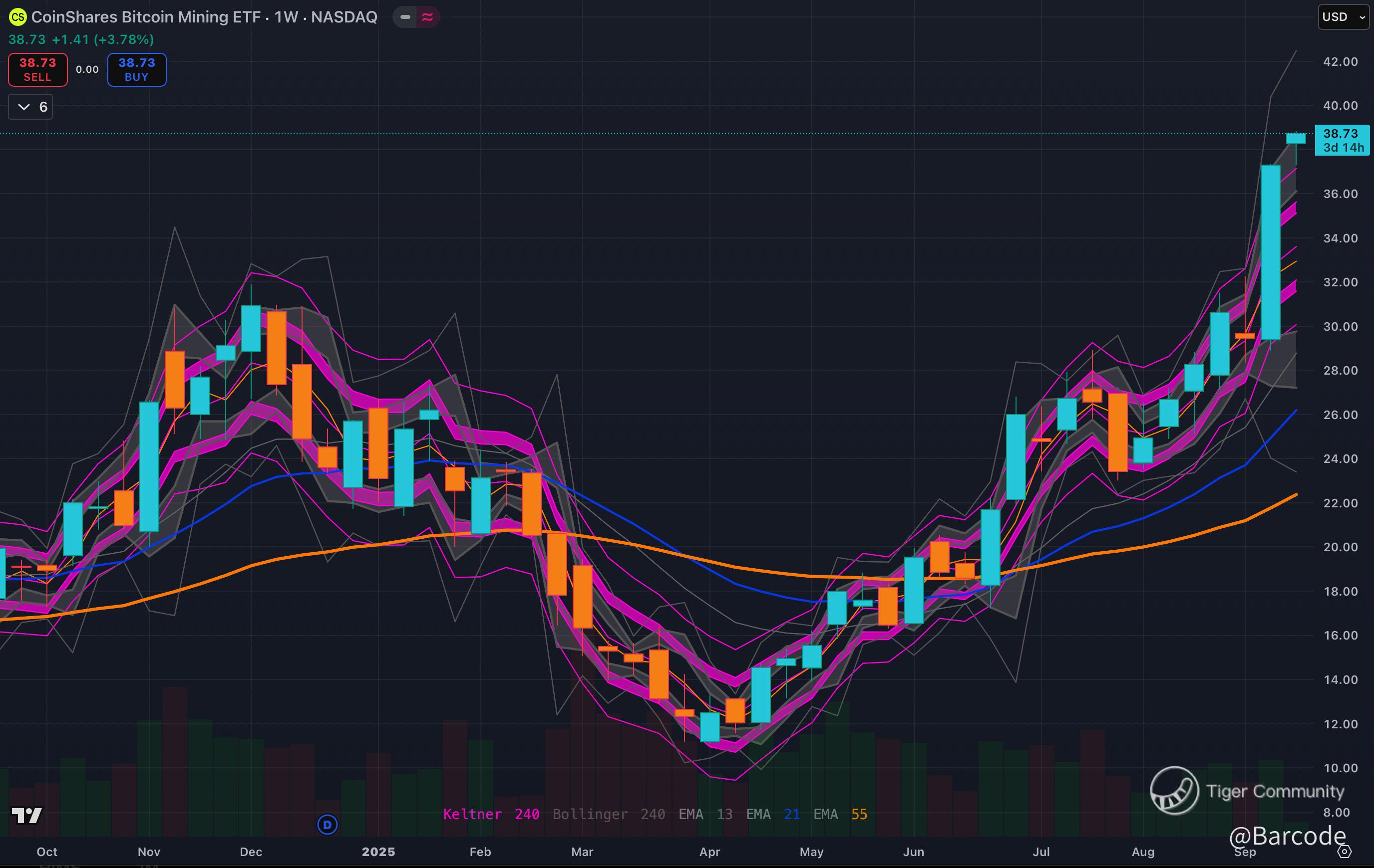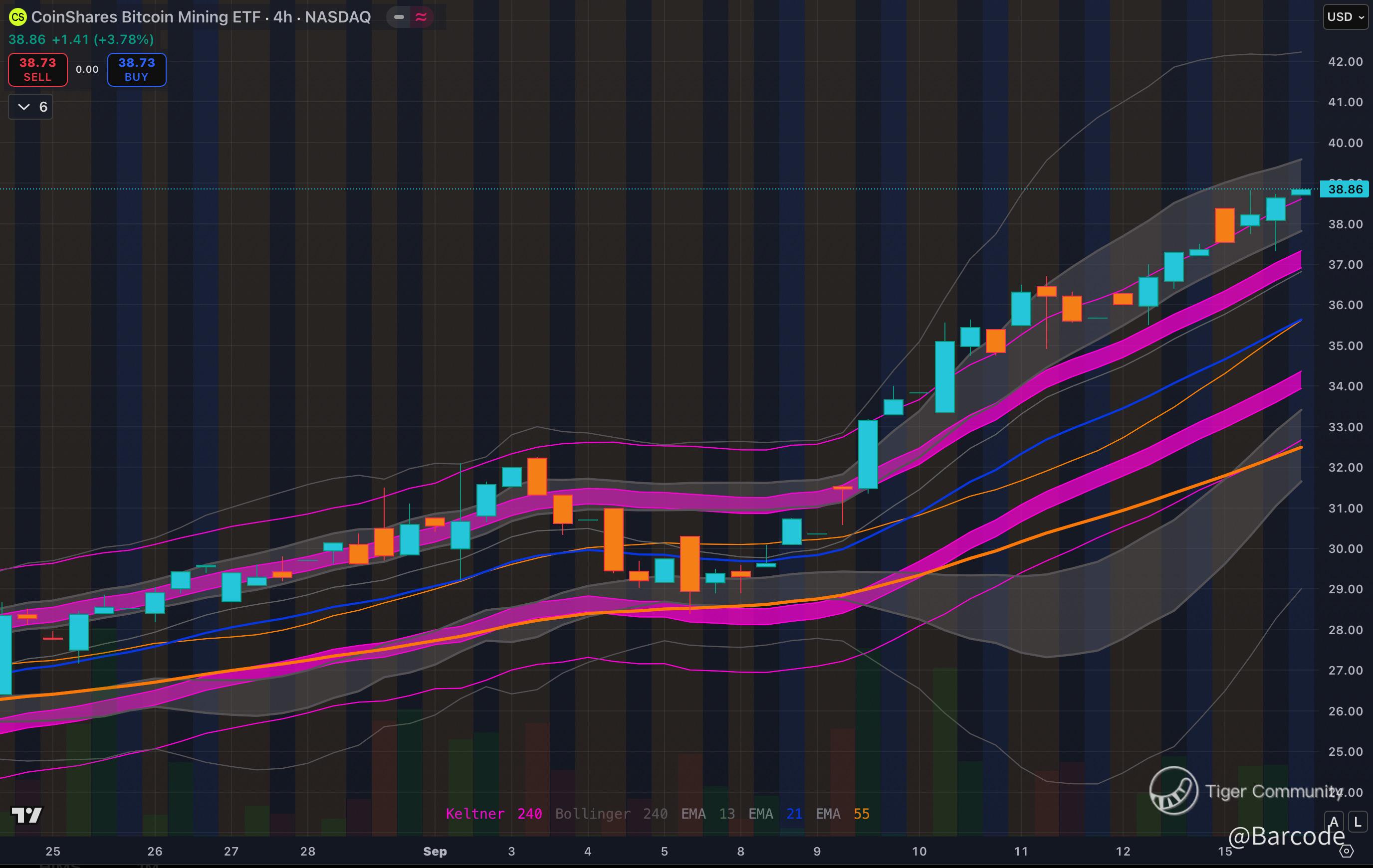 On the weekly, WGMI is surging through Bollinger and Keltner bands with volume confirmation. Supports are layered at $32.50 and $28.00, creating a cushion for bulls. On the 4H, the 13/21/55 EMA cluster is acting as a launchpad; every dip into it has been defended. Momentum remains intact as long as $37.50 holds, with the stair-step structure suggesting more upside.