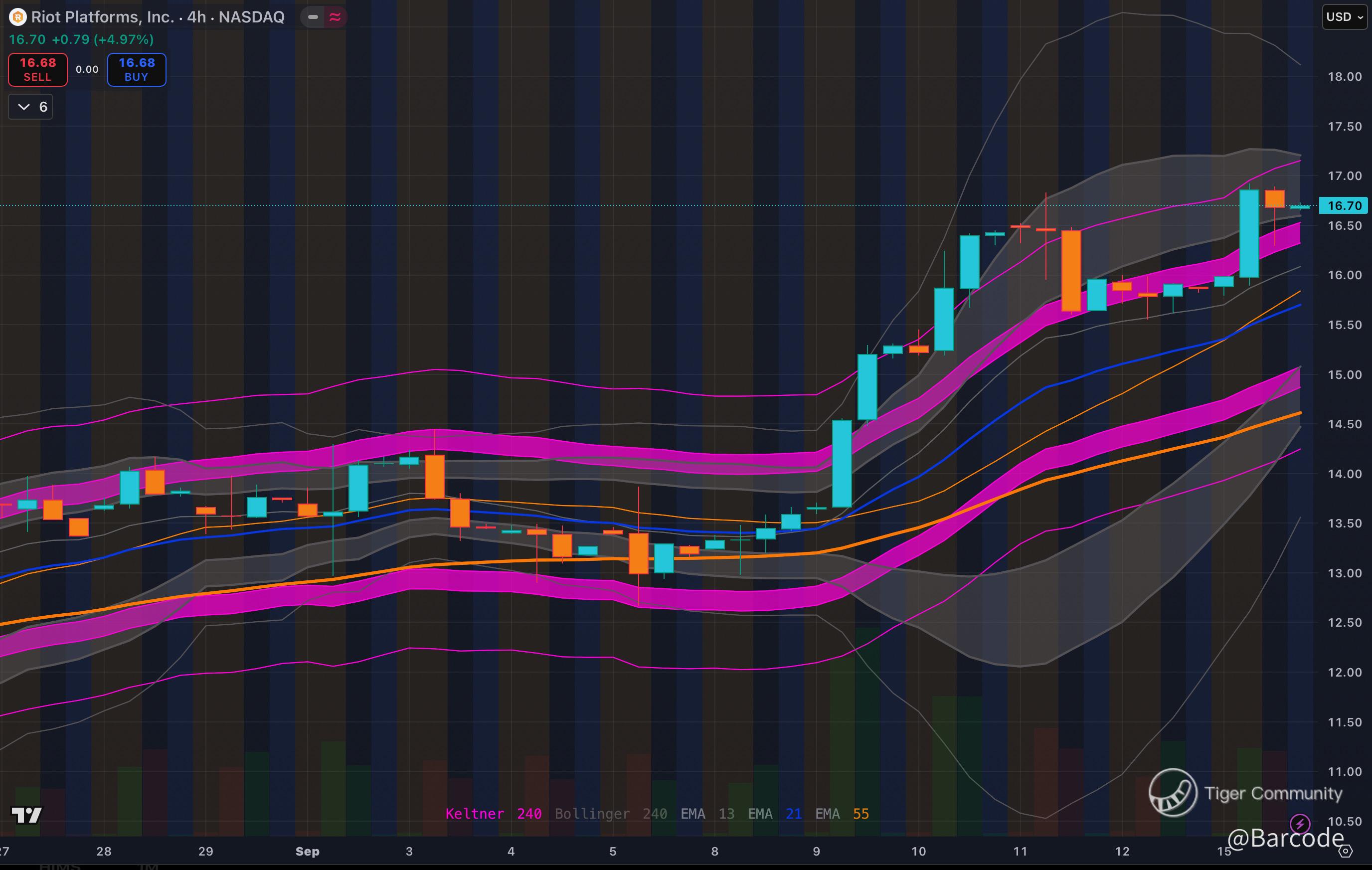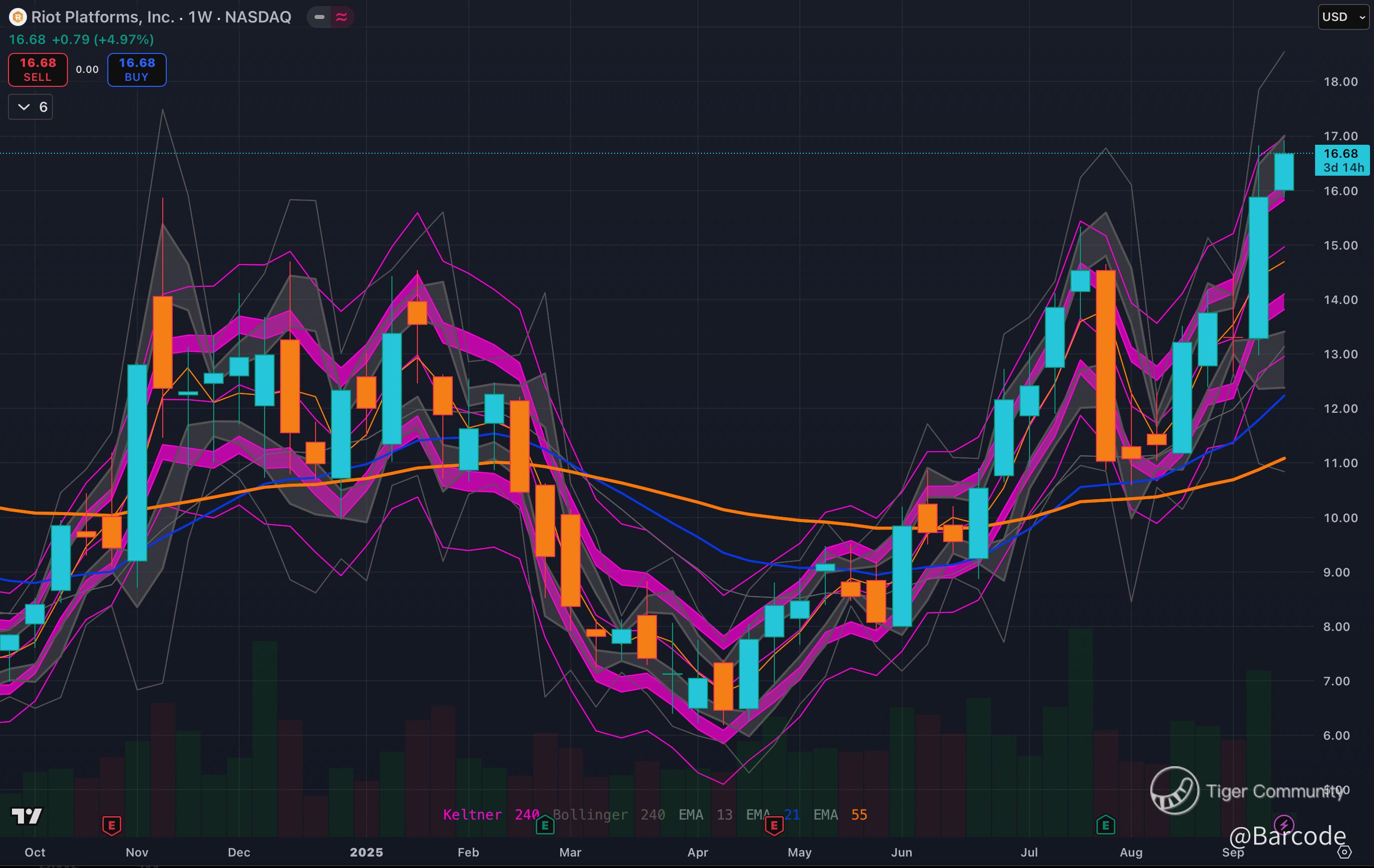 $RIOT is mirroring WGMI’s structure. Weekly price reclaimed $16 with conviction, breaking its range and setting sights on $18.20 then $20.50. On the 4H, the impulsive push from $13, $17 is now consolidating at the upper band. This is the type of healthy pause that sets the stage for a next surge. With RIOT as a key WGMI component, the ETF’s strength directly boosts RIOT’s outlook.