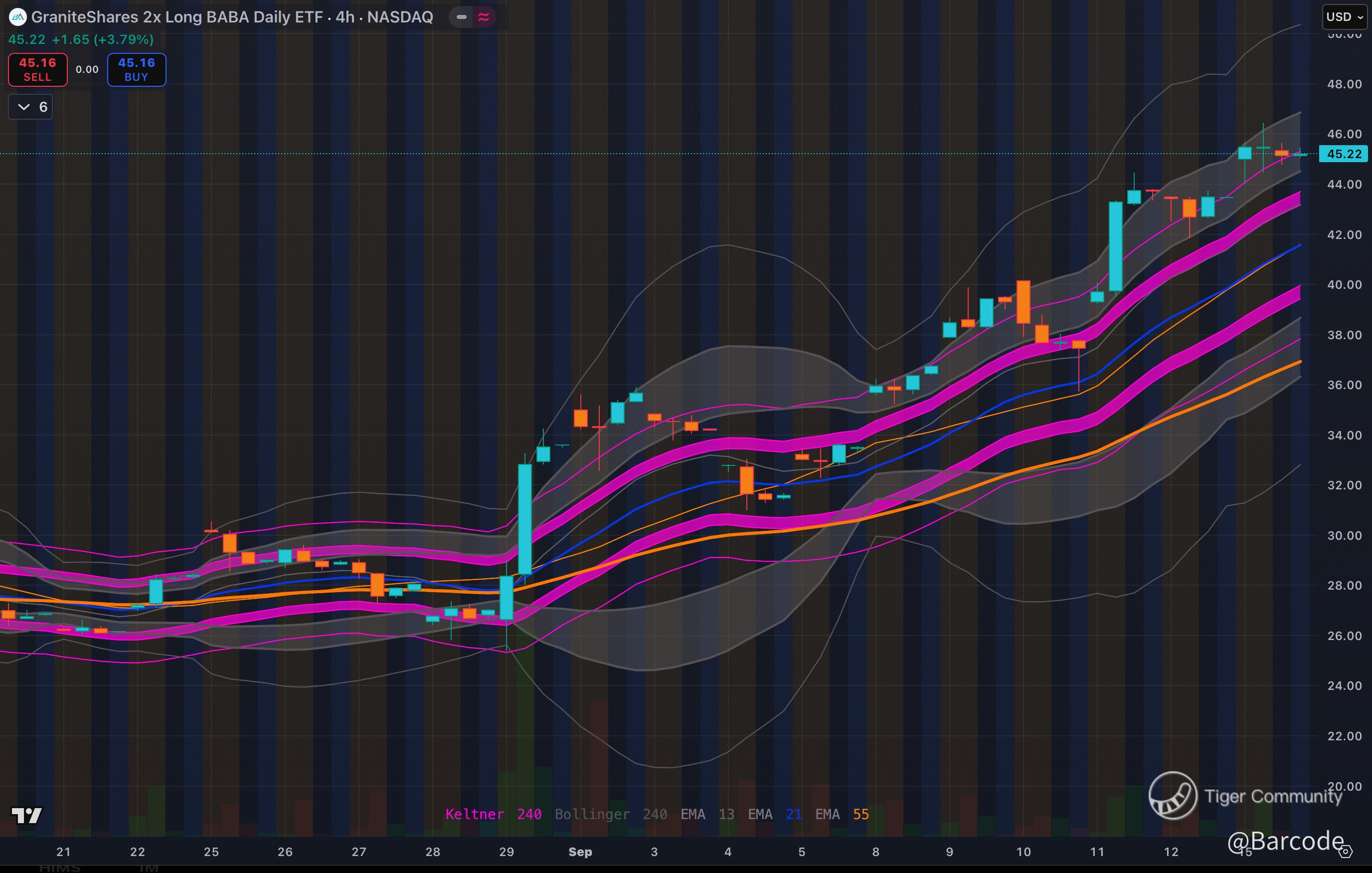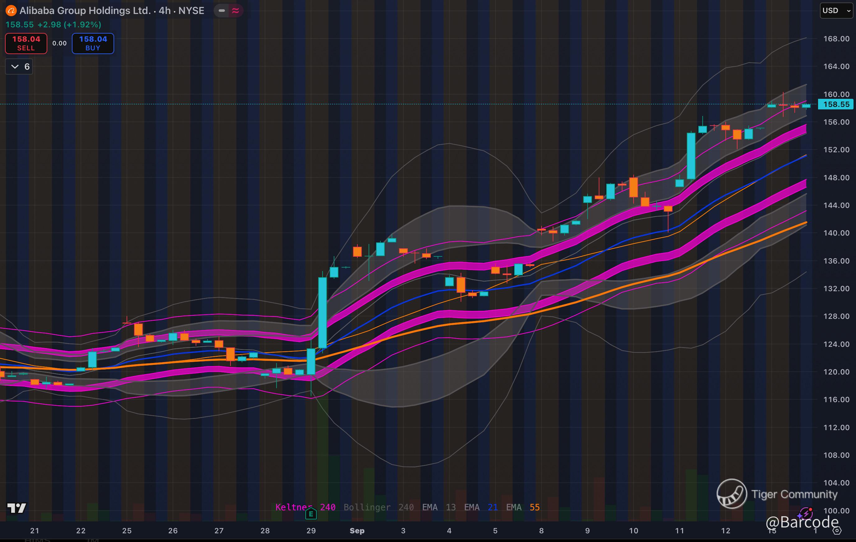 $Alibaba(BABA)$ $GRANITESHARES 2X LONG BABA DAILY ETF(BABX)$ 🐉🇨🇳💹 $BABA is breathing fire right now. The 1H chart shows a powerful rising channel, pushing near 160 with room toward the 172 magnet. Both the 4H Bollinger and Keltner bands are expanding like a dragon spreading its wings, signalling volatility ignition.