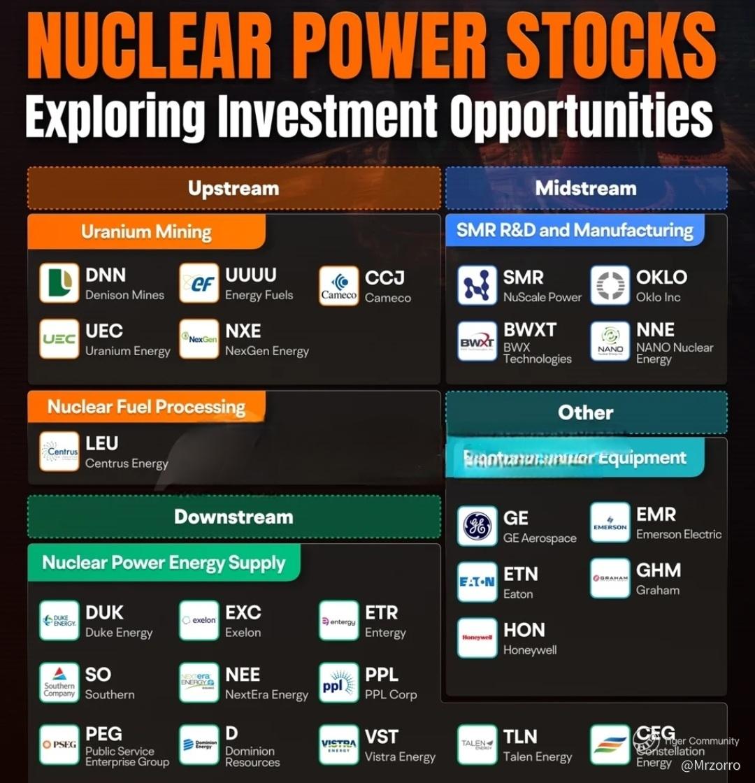 The stock market has been quick to recognize this trend. Shares of $Oklo Inc (OKLO.US)$ have soared over 350% year-to-date, while uranium supplier$Centrus Energy (LEU.US)$ is up 265%. $Korea Electric Power (KEP.US)$ has doubled, and $Energy Fuels (UUUU.US)$ has gained 170%. $NuScale Power (SMR.US)$ has climbed nearly 120%, with$GE Vernova (GEV.US)$ rising more than 90% as investors embrace its transformation into a clean-energy infrastructure leader. $Talen Energy (TLN.US)$ and $Uranium Energy (UEC.US)$ have also advanced strongly.