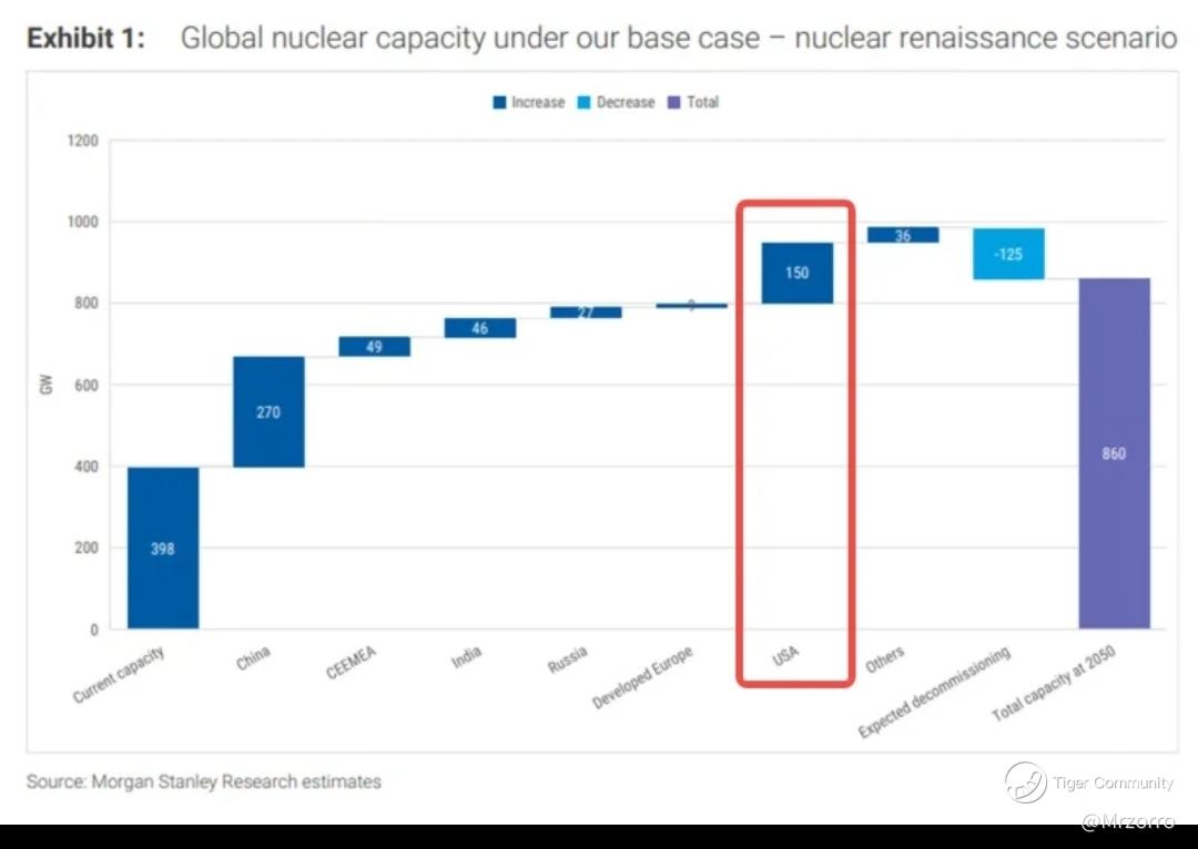 Morgan Stanley recently highlighted the trajectory, describing the U.S. nuclear revival as "increasingly clear." The bank projects that total nuclear capacity in the United States could reach 150 gigawatts by 2050, a dramatic increase that would reshape both domestic energy markets and the global nuclear supply chain.
