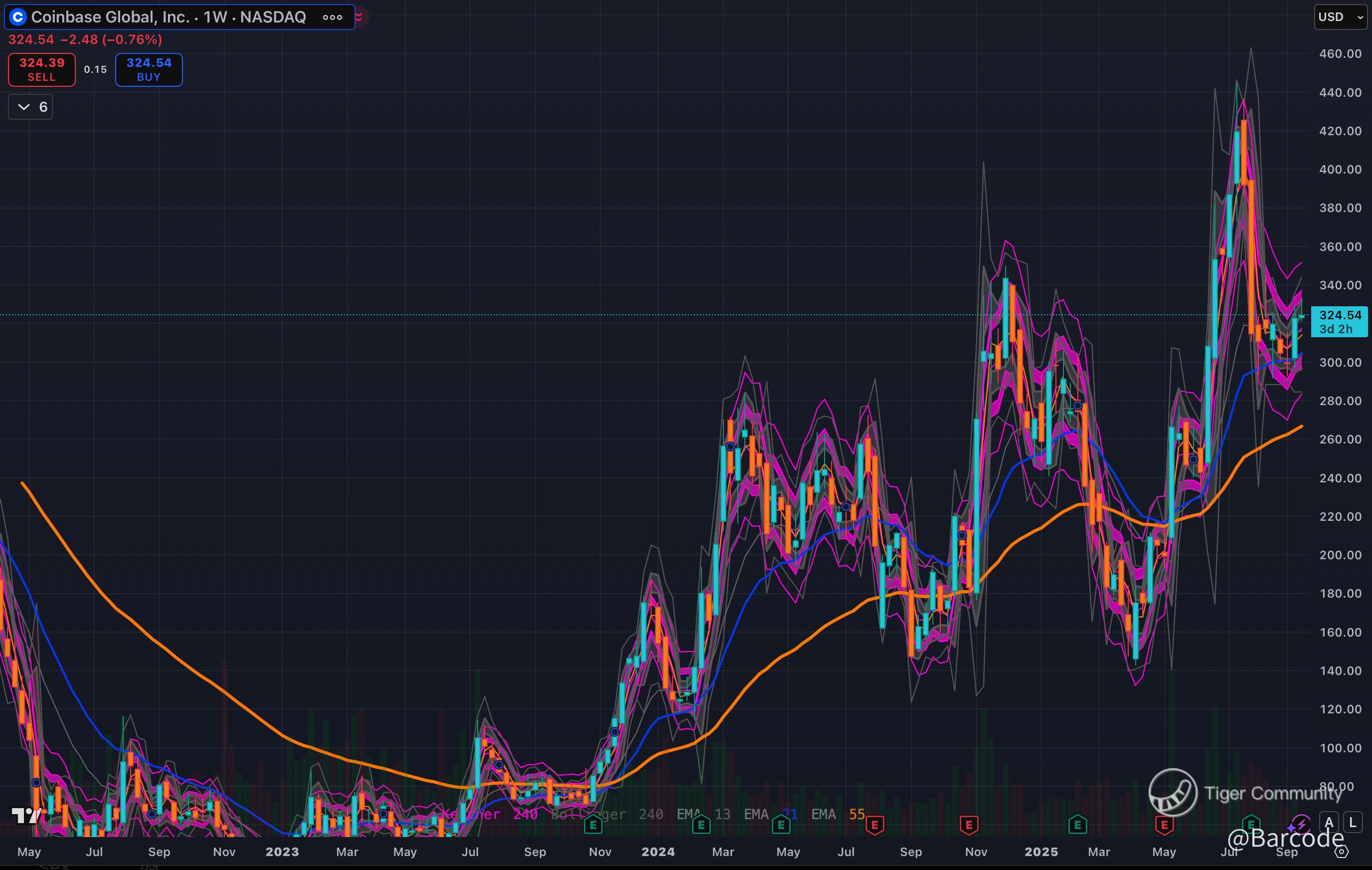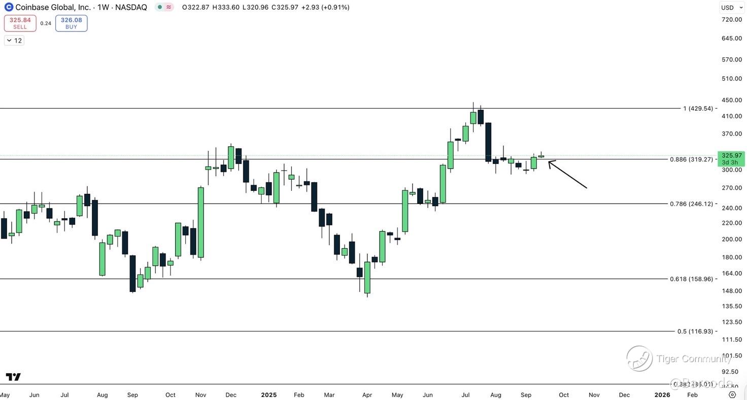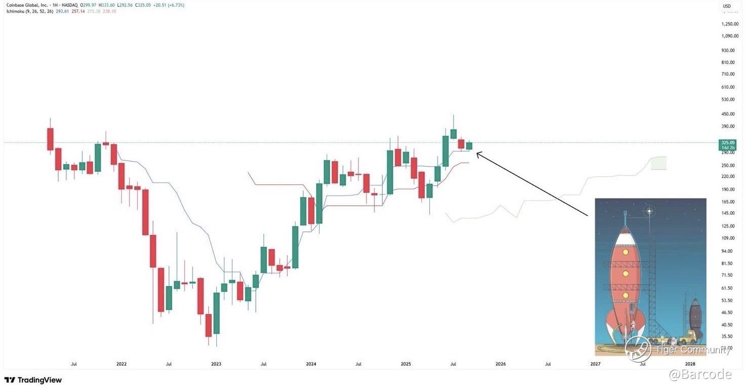 I’m watching $COIN lean hard on the Ichimoku Tenkan line as a launching pad. At $325, this level isn’t just psychological; it’s structural. A monthly close above Tenkan support confirms trend strength and keeps the reaccumulation phase intact. Lose it, and the entire bull thesis risks slipping into a liquidity reset.
