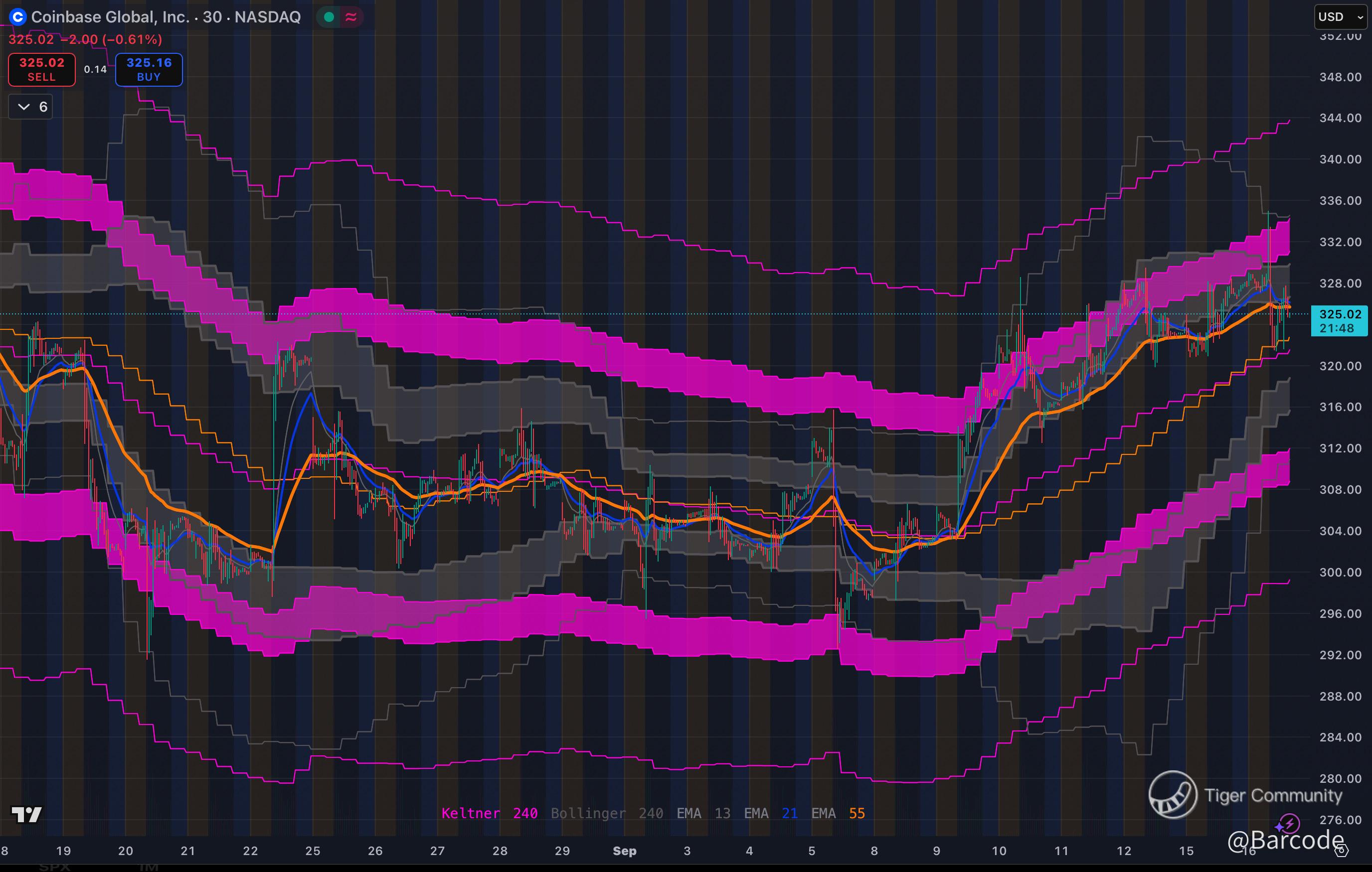On both the 4H and 30M, price is pressing against the upper Keltner and Bollinger bands. These squeezes don’t last forever. When they expand, the move is usually directional. Above $325, bias leans bullish; $318 is the secondary defense level that must hold to keep this setup valid.