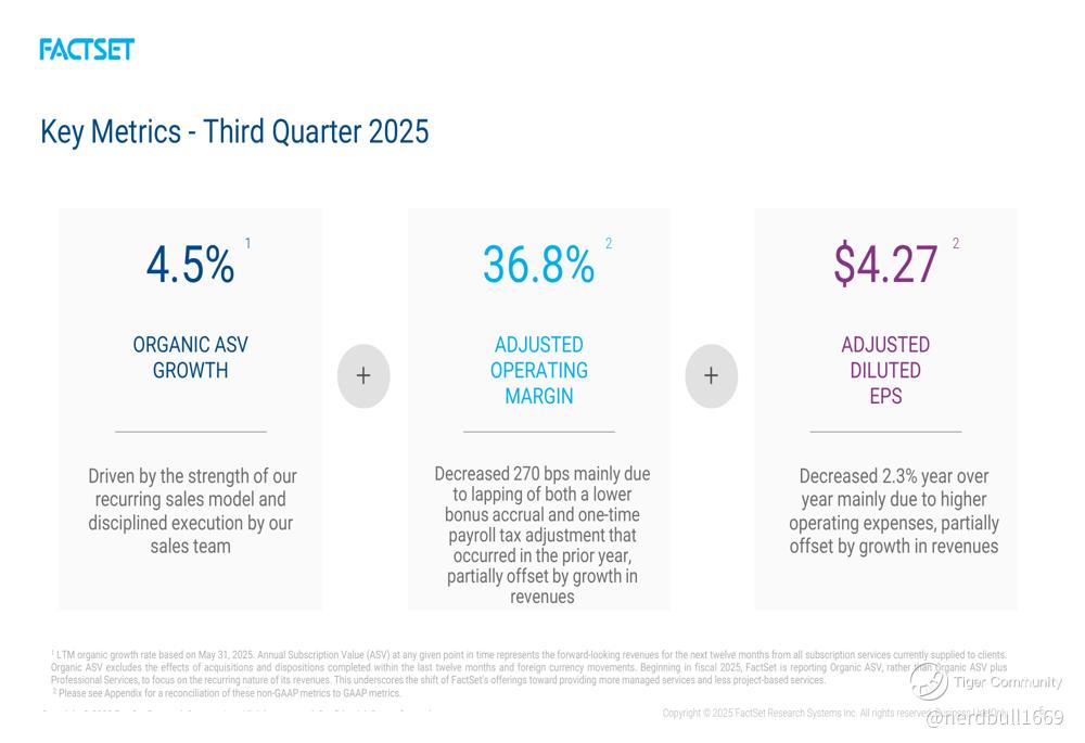 Based on FactSet Research Systems (FDS) fiscal Q3 2025 earnings reported on June 23, 2025, the company delivered a mixed performance, demonstrating top-line strength but continued pressure on profitability.