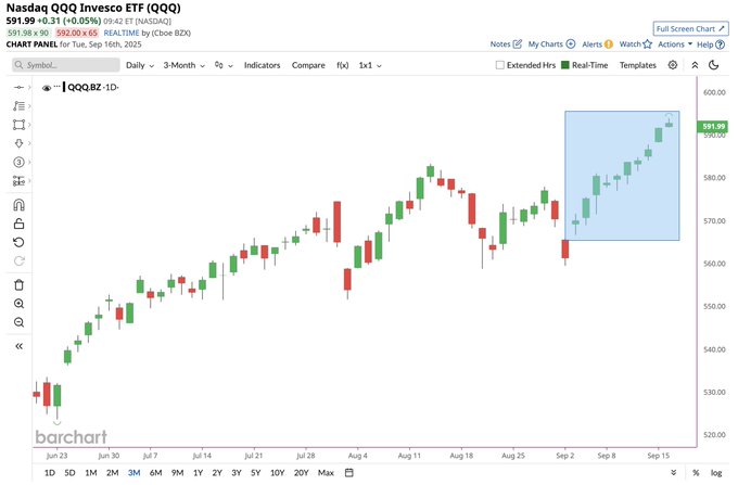 Nasdaq is going for its 10th consecutive green day, its longest winning streak since November 2021