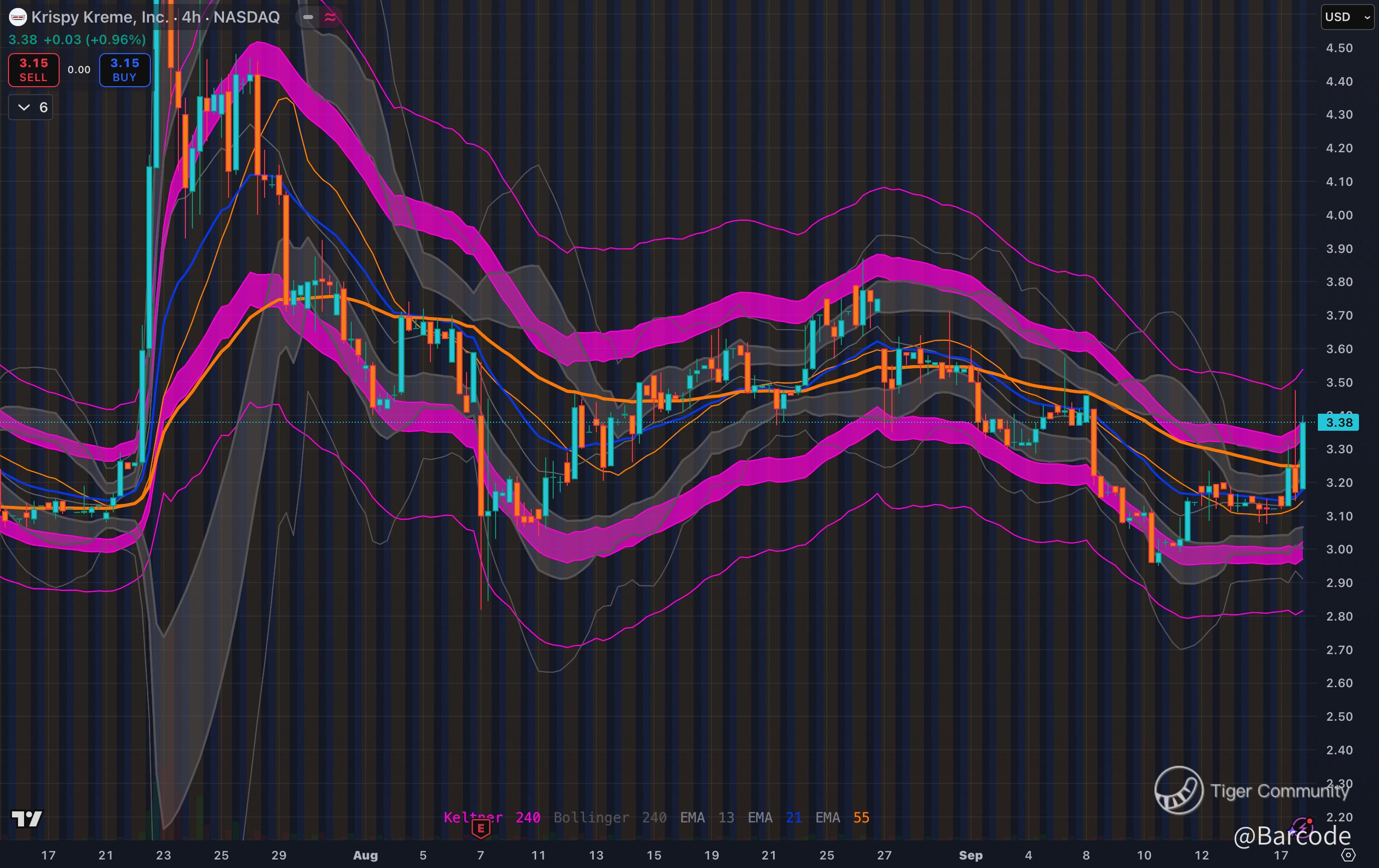 On the 4H chart, DNUT broke out of a tight Keltner/Bollinger squeeze.