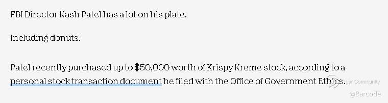 Patel’s ethics filing revealed up to $50,000 in Krispy Kreme and $100,000 in ON. He insisted there’s “no current conflict,” but the timing raises eyebrows: DNUT is facing shareholder lawsuits over a 2024 data breach tied to ransomware group Play, the same group the FBI is investigating. That’s an extraordinary juxtaposition: the Bureau probing a breach while its Director is a shareholder.