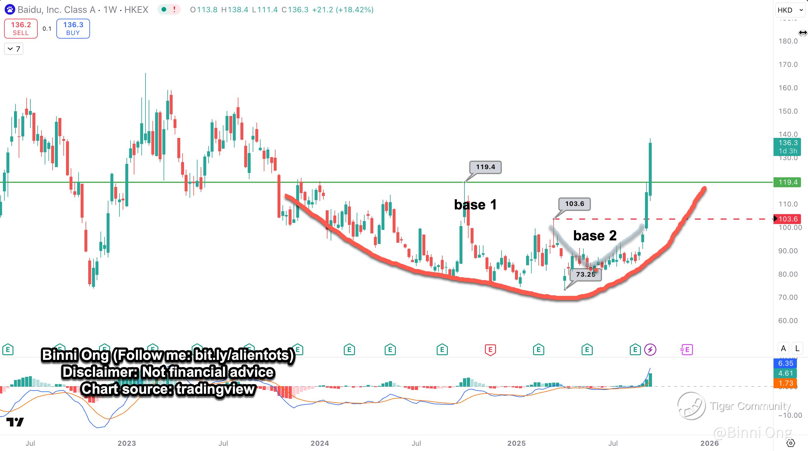 With the stock already trading above HK$136, Baidu has exceeded the smaller Base 2 projection and is now on track toward the larger Base 1 target. Momentum remains positive after the strong breakout, supported by heavy volume and improving MACD readings.