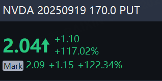 A total number of 2.93M options related to $Nvidia(NVDA)$ were traded on Wednesday, up 122% from the previous trading day, of which call options accounted for 65%. Particularly high volume was seen for the $170 strike put option expiring Sept. 19, with 178,894 contracts trading. The $170 Nvidia strike put option expiring Sept. 19 surged 122% on Wednesday. $NVDA 20250919 170.0 PUT$