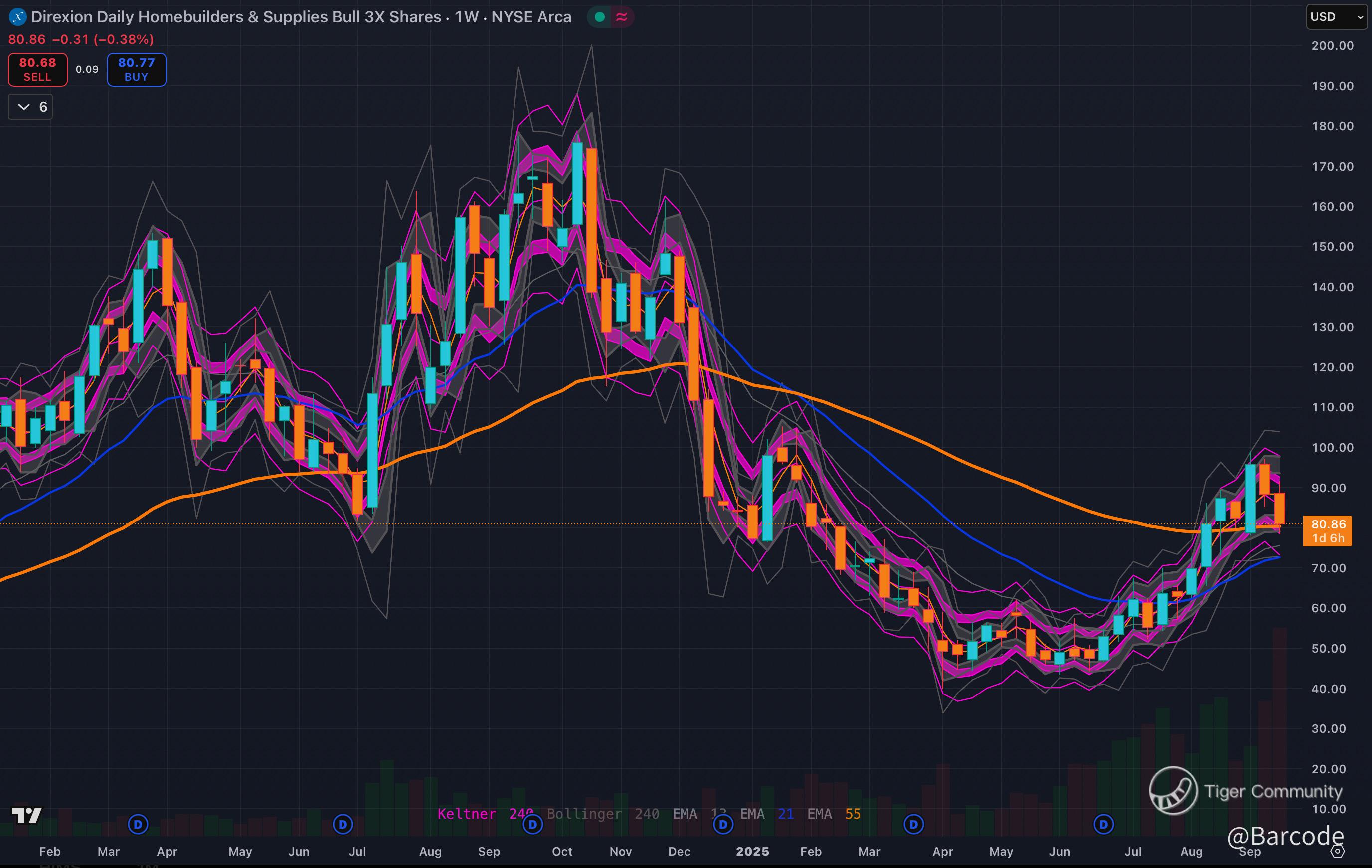 On the weekly view, $NAIL has already retraced off its recent peak but is still holding above the 55 EMA, while volume expansion earlier this year signals strong participation on the way up. This type of pullback into trend support often sets up the next leg higher if the macro housing trade remains intact.