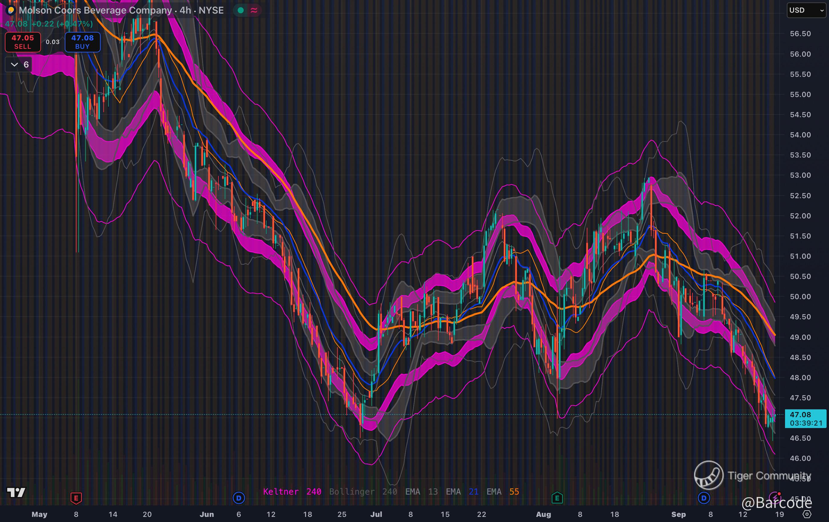 I’m watching Constellation ($STZ) sitting at $133, collapsing from the $180s as it approaches critical pandemic lows. Molson Coors ($TAP) tells a similar story, sliding toward the lower liquidity shelf at $47. Anheuser-Busch ($ABI), weighed down by Bud Light volume losses, has already broken trend and is testing decade-level supports.