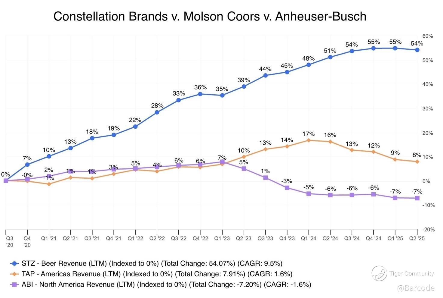 I’m convinced the US beer market is witnessing one of the sharpest shifts in decades. Mexican beer brands under Constellation ($STZ) have steadily gained share, posting 54% revenue growth since 2020 with a 9.5% CAGR. By contrast, Molson Coors ($TAP) is up only 7.9% over the same period and Anheuser-Busch ($ABI) is in outright decline, down -7.2%. This divergence has never been more clear.