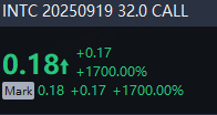 A total number of 3.15M options related to $Intel(INTC)$ were traded on Thursday, 8 times higher than the previous trading day, of which call options accounted for 71%. Particularly high volume was seen for the $32 strike call option expiring Sept. 19, with 106,062 contracts trading. The $32 Intel strike call option expiring Sept. 19 surged 1700% on Thursday. $INTC 20250919 32.0 CALL$