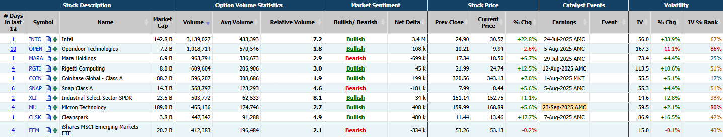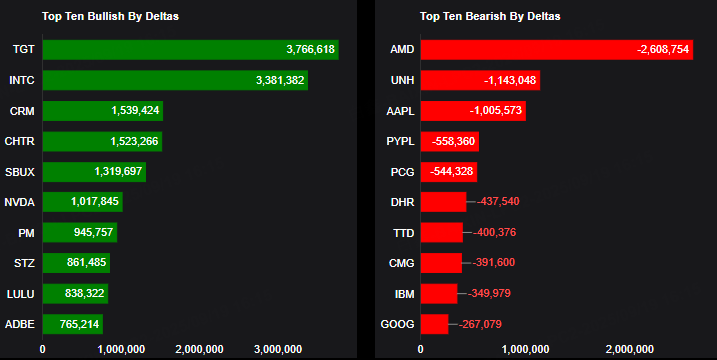 This report shows stocks with the highest volume of bullish and bearish activity by option delta volume, which converts option volume to an equivalent stock volume (bought or sold).