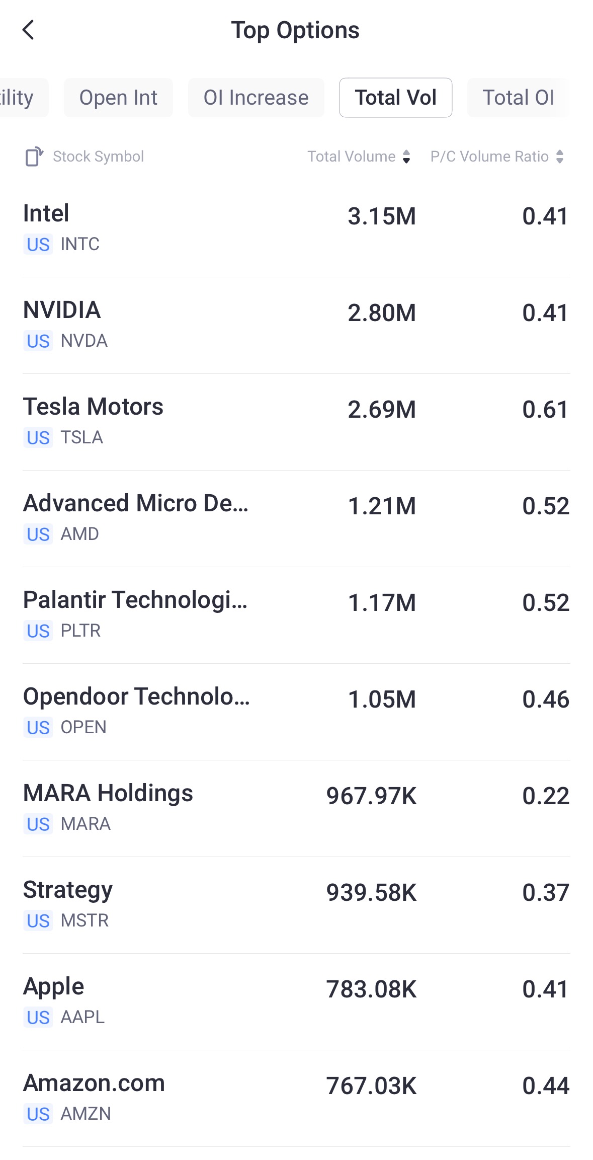 Top 10 Option Volumes