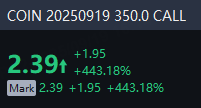 A total number of 596,207 options related to $(COIN)$ were traded on Thursday, up 284% from the previous trading day, of which call options accounted for 75%. Particularly high volume was seen for the $350 strike call option expiring Sep. 19, with 43,468 contracts trading. The $350 Coinbase strike call option expiring Sep. 19 surged 443% on Thursday. $COIN 20250919 350.0 CALL$