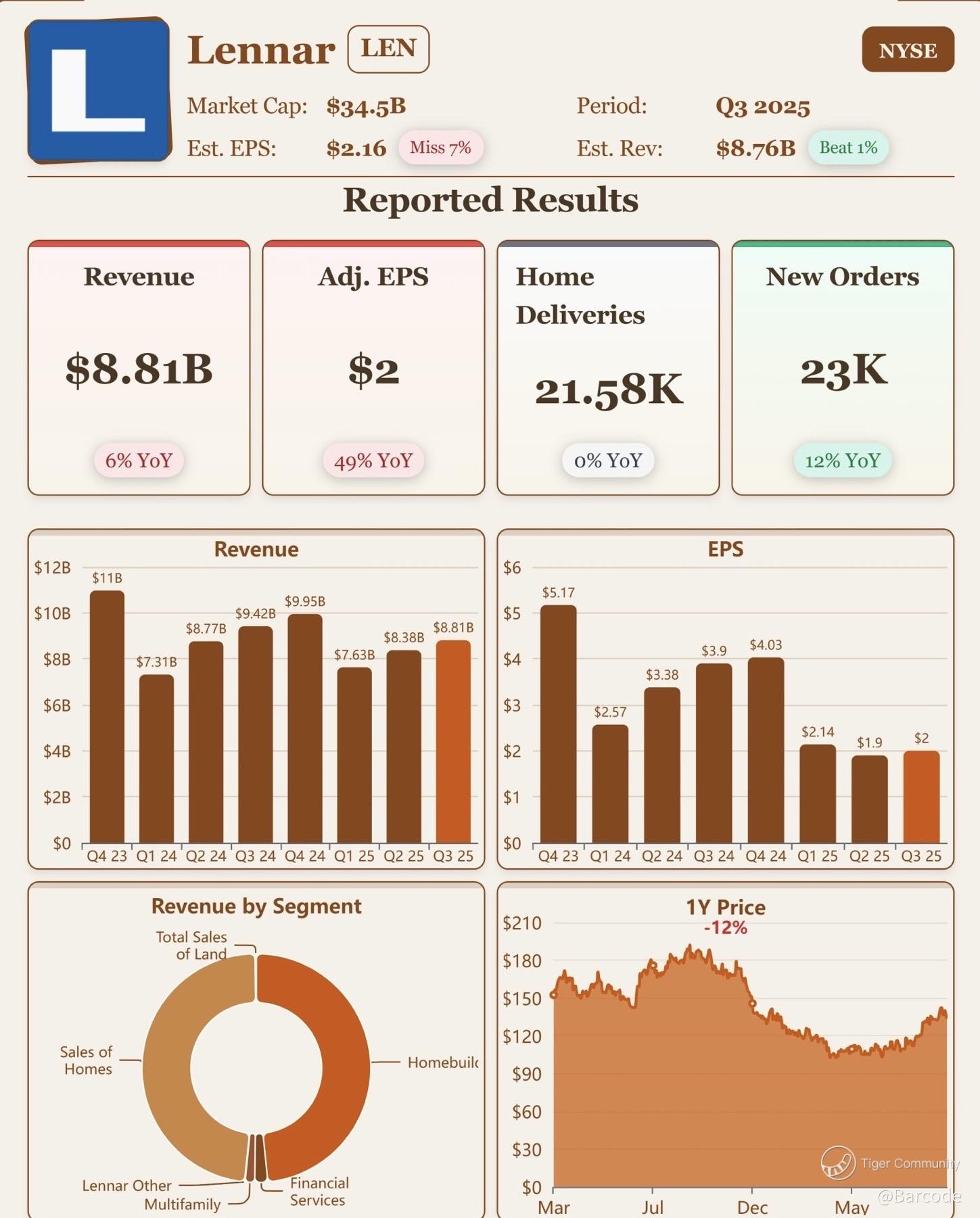 $Lennar(LEN)$ $D.R. Horton(DHI)$ $PulteGroup(PHM)$ Lennar ($LEN) delivered Q3 results that showed strength in demand but continued erosion in profitability. Orders surged, yet the path to earnings power looks increasingly fragile.