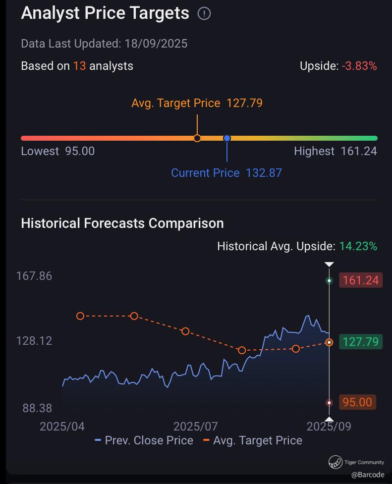 • Avoid now; wait for $127 (avg PT) to enter with better risk-reward.